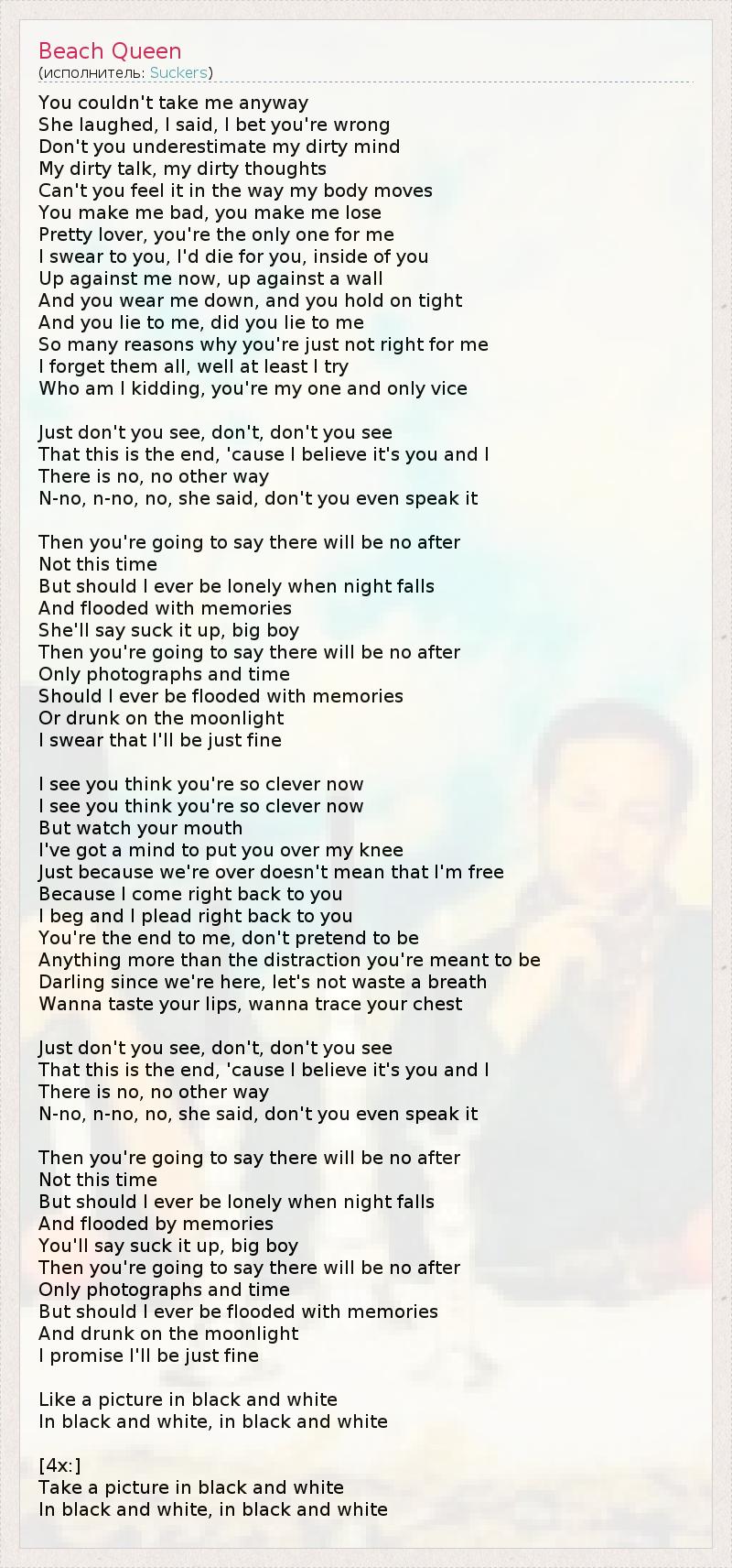 "Ты всё равно не овладел бы мной", Она засмеялась. Я сказал: "Уверен, ты заблуждаешься. Не стоит недооценивать мою порочную душу, Мои непристойные разговоры, мои грязные мысли - Разве ты не чувствуешь это в движениях моего тела? Ты делаешь меня неумелым, ты превращаешь меня в лузера. Прелестная любовница, для меня ты - единственная. Я клянусь, я готов умереть за тебя, раствориться в тебе. Сейчас мы лицом к лицу, мы припёрты к стенке. Ты подавляешь меня, крепко держишь И врешь, ты ведь врала мне? Почему ты не для меня? Есть много причин. Я их все забыл, ну, или, по крайней мере, стараюсь. Кого я обманываю? Ты мое единственное слабое место. Просто ты не видишь, нет, не видишь то, Что это конец. Я полагаю для нас Нет никакого другого пути." "Нет, нет, нет, не говори так", - умоляет она. Затем скажет, что ничего не будет. Не в этот раз. Но, если когда-нибудь под покровом ночи я буду один И нахлынут воспоминания, Она промолвит: смирись с этим, большой мальчик. Потом напомнит, что ничего не будет. Только фотографии и время. Если на меня когда-нибудь нахлынут воспоминания Или я опьянею от лунного света, Клянусь, что у меня все будет хорошо. Я вижу, ты думаешь, что ты такая умная сейчас. Я вижу, ты думаешь, что ты такая умная сейчас. Но следи за языком. В моих мыслях отшлёпать тебя. Одно то, что НАС больше нет, ещё не значит, что я свободен. Я могу вернуть тебя. Я умоляю, я прошу, вернись ко мне. Ты угасла для меня. Не претендуй на Нечто большее, чем развлечение, которым ты и должна быть. Дорогая, поскольку мы здесь, давай не будем попусту тратить слова. Хочу ощутить вкус твоих губ, прикоснуться к твоей груди. Просто ты не видишь, нет, не видишь то, Что это конец. Я полагаю для нас Нет никакого другого пути. "Нет, нет, нет, не говори так," - умоляет она. Затем скажет, что ничего не будет. Не в этот раз. Но, если когда-нибудь под покровом ночи я буду один И нахлынут воспоминания, Она промолвит: смирись с этим, большой мальчик. Потом напомнит, что ничего не будет. Только фотографии и время. Если на меня когда-нибудь нахлынут воспоминания Или я опьянею от лунного света, Клянусь, что у меня все будет хорошо. Как образ, черно-белый Черно-белый, черно-белый. [4x:] Как образ, черно-белый Черно-белый, черно-белый.