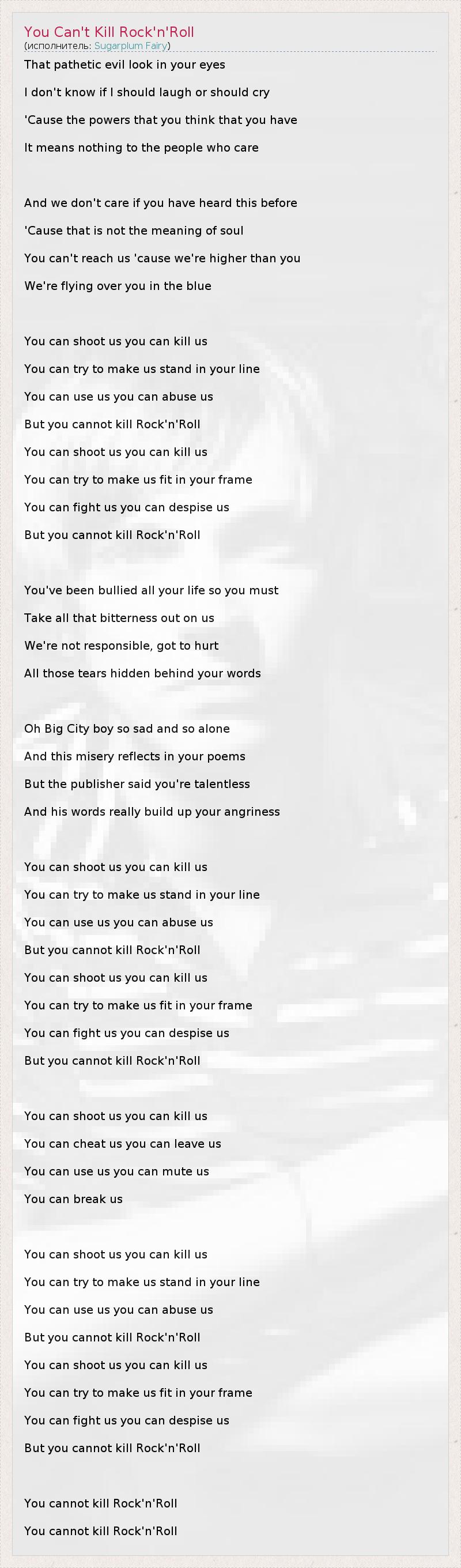 That pathetic evil look in your eyes I don't know if I should laugh or should cry 'Cause the powers that you think that you have It means nothing to the people who care And we don't care if you have heard this before 'Cause that is not the meaning of soul You can't reach us 'cause we're higher than you We're flying over you in the blue You can shoot us you can kill us You can try to make us stand in your line You can use us you can abuse us But you cannot kill Rock'n'Roll You can shoot us you can kill us You can try to make us fit in your frame You can fight us you can despise us But you cannot kill Rock'n'Roll You've been bullied all your life so you must Take all that bitterness out on us We're not responsible, got to hurt All those tears hidden behind your words Oh Big City boy so sad and so alone And this misery reflects in your poems But the publisher said you're talentless And his words really build up your angriness You can shoot us you can kill us You can try to make us stand in your line You can use us you can abuse us But you cannot kill Rock'n'Roll You can shoot us you can kill us You can try to make us fit in your frame You can fight us you can despise us But you cannot kill Rock'n'Roll You can shoot us you can kill us You can cheat us you can leave us You can use us you can mute us You can break us You can shoot us you can kill us You can try to make us stand in your line You can use us you can abuse us But you cannot kill Rock'n'Roll You can shoot us you can kill us You can try to make us fit in your frame You can fight us you can despise us But you cannot kill Rock'n'Roll You cannot kill Rock'n'Roll You cannot kill Rock'n'Roll