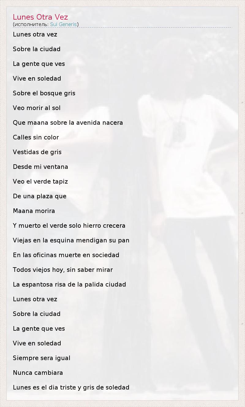 Lunes otra vez Sobre la ciudad La gente que ves Vive en soledad Sobre el bosque gris Veo morir al sol Que maana sobre la avenida nacera Calles sin color Vestidas de gris Desde mi ventana Veo el verde tapiz De una plaza que Maana morira Y muerto el verde solo hierro crecera Viejas en la esquina mendigan su pan En las oficinas muerte en sociedad Todos viejos hoy, sin saber mirar La espantosa risa de la palida ciudad Lunes otra vez Sobre la ciudad La gente que ves Vive en soledad Siempre sera igual Nunca cambiara Lunes es el dia triste y gris de soledad