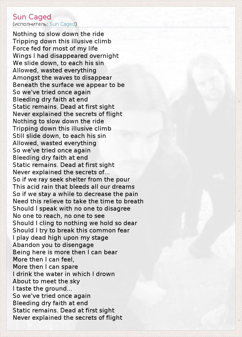 Nothing to slow down the ride Tripping down this illusive climb Force fed for most of my life Wings I had disappeared overnight We slide down, to each his sin Allowed, wasted everything Amongst the waves to disappear Beneath the surface we appear to be So we've tried once again Bleeding dry faith at end Static remains. Dead at first sight Never explained the secrets of flight Nothing to slow down the ride Tripping down this illusive climb Still slide down, to each his sin Allowed, wasted everything So we've tried once again Bleeding dry faith at end Static remains. Dead at first sight Never explained the secrets of... So if we ray seek shelter from the pour This acid rain that bleeds all our dreams So if we stay a while to decrease the pain Need this relieve to take the time to breath Should I speak with no one to disagree No one to reach, no one to see Should I cling to nothing we hold so dear Should I try to break this common fear I play dead high upon my stage Abandon you to disengage Being here is more then I can bear More then I can feel, More then I can spare I drink the water in which I drown About to meet the sky I taste the ground... So we've tried once again Bleeding dry faith at end Static remains. Dead at first sight Never explained the secrets of flight