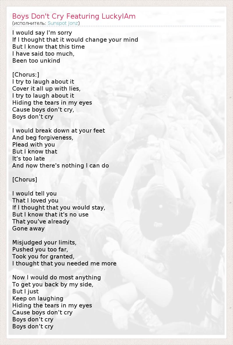 Я бы сказал "извини", Если бы думал, что это изменит твоё решение, Но я знаю, что на этот раз Я сказал слишком много, Сделал много плохого [Припев:] Я пытаюсь смеяться над этим, Покрыть всё это ложью, Я пытаюсь смеяться над этим, Прячу слёзы в своих глазах, Потому что мальчики не плачут, Мальчики не плачут Я бы упал у твоих ног И умолял о прощении, Молил бы тебя, Но я знаю, Что уже слишком поздно И теперь я ничего не могу сделать [Припев] Я бы сказал, Что люблю тебя, Если бы думал, что ты могла бы остаться, Но я знаю, что это бесполезно, Что ты уже Ушла прочь Неверно оценил твои границы, Оттолкнул тебя слишком далеко, Принимал тебя как должное, Я думал, ты нуждалась во мне больше Сейчас я бы сделал всё, Чтобы вернуть тебя обратно, Но я просто Продолжаю смеяться, Пряча слёзы в глазах, Потому что мальчики не плачут, Мальчики не плачут, Мальчики не плачут