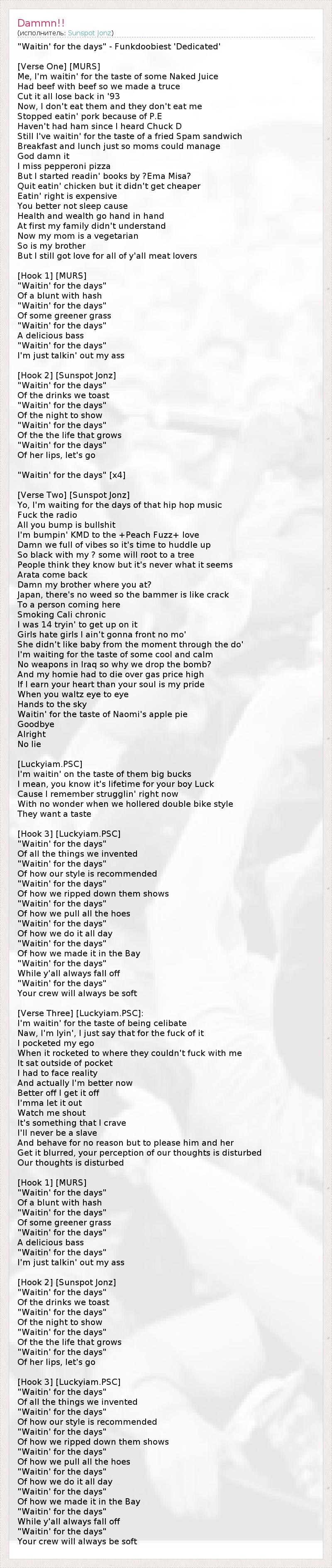 "Waitin' for the days" - Funkdoobiest 'Dedicated' [Verse One] [MURS] Me, I'm waitin' for the taste of some Naked Juice Had beef with beef so we made a truce Cut it all lose back in '93 Now, I don't eat them and they don't eat me Stopped eatin' pork because of P.E Haven't had ham since I heard Chuck D Still I've waitin' for the taste of a fried Spam sandwich Breakfast and lunch just so moms could manage God damn it I miss pepperoni pizza But I started readin' books by ?Ema Misa? Quit eatin' chicken but it didn't get cheaper Eatin' right is expensive You better not sleep cause Health and wealth go hand in hand At first my family didn't understand Now my mom is a vegetarian So is my brother But I still got love for all of y'all meat lovers [Hook 1] [MURS] "Waitin' for the days" Of a blunt with hash "Waitin' for the days" Of some greener grass "Waitin' for the days" A delicious bass "Waitin' for the days" I'm just talkin' out my ass [Hook 2] [Sunspot Jonz] "Waitin' for the days" Of the drinks we toast "Waitin' for the days" Of the night to show "Waitin' for the days" Of the the life that grows "Waitin' for the days" Of her lips, let's go "Waitin' for the days" [x4] [Verse Two] [Sunspot Jonz] Yo, I'm waiting for the days of that hip hop music Fuck the radio All you bump is bullshit I'm bumpin' KMD to the +Peach Fuzz+ love Damn we full of vibes so it's time to huddle up So black with my ? some will root to a tree People think they know but it's never what it seems Arata come back Damn my brother where you at? Japan, there's no weed so the bammer is like crack To a person coming here Smoking Cali chronic I was 14 tryin' to get up on it Girls hate girls I ain't gonna front no mo' She didn't like baby from the moment through the do' I'm waiting for the taste of some cool and calm No weapons in Iraq so why we drop the bomb? And my homie had to die over gas price high If I earn your heart than your soul is my pride When you waltz eye to eye Hands to the sky Waitin' for the taste of Naomi's apple pie Goodbye Alright No lie [Luckyiam.PSC] I'm waitin' on the taste of them big bucks I mean, you know it's lifetime for your boy Luck Cause I remember strugglin' right now With no wonder when we hollered double bike style They want a taste [Hook 3] [Luckyiam.PSC] "Waitin' for the days" Of all the things we invented "Waitin' for the days" Of how our style is recommended "Waitin' for the days" Of how we ripped down them shows "Waitin' for the days" Of how we pull all the hoes "Waitin' for the days" Of how we do it all day "Waitin' for the days" Of how we made it in the Bay "Waitin' for the days" While y'all always fall off "Waitin' for the days" Your crew will always be soft [Verse Three] [Luckyiam.PSC]: I'm waitin' for the taste of being celibate Naw, I'm lyin', I just say that for the fuck of it I pocketed my ego When it rocketed to where they couldn't fuck with me It sat outside of pocket I had to face reality And actually I'm better now Better off I get it off I'mma let it out Watch me shout It's something that I crave I'll never be a slave And behave for no reason but to please him and her Get it blurred, your perception of our thoughts is disturbed Our thoughts is disturbed [Hook 1] [MURS] "Waitin' for the days" Of a blunt with hash "Waitin' for the days" Of some greener grass "Waitin' for the days" A delicious bass "Waitin' for the days" I'm just talkin' out my ass [Hook 2] [Sunspot Jonz] "Waitin' for the days" Of the drinks we toast "Waitin' for the days" Of the night to show "Waitin' for the days" Of the the life that grows "Waitin' for the days" Of her lips, let's go [Hook 3] [Luckyiam.PSC] "Waitin' for the days" Of all the things we invented "Waitin' for the days" Of how our style is recommended "Waitin' for the days" Of how we ripped down them shows "Waitin' for the days" Of how we pull all the hoes "Waitin' for the days" Of how we do it all day "Waitin' for the days" Of how we made it in the Bay "Waitin' for the days" While y'all always fall off "Waitin' for the days" Your crew will always be soft