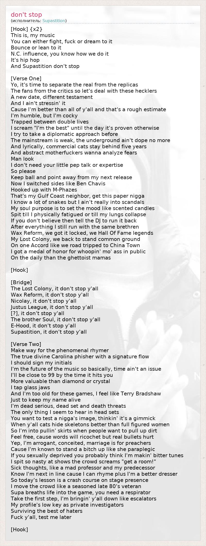 Это интересно:Supastition это MC из Greenville, North Carolina (в данном время он проживает в городе Charlotte).За свою карьеру ему удалось поработать с KRS-One, Cunninlynguists и Little Brother. У него есть 4 сольных альбома: 7 Years of Bad Luck (2002), The Deadline (2004), Chain Letters ( 2005) и альбом Splitting Image (2009) под псевдонимом Kam Moye.