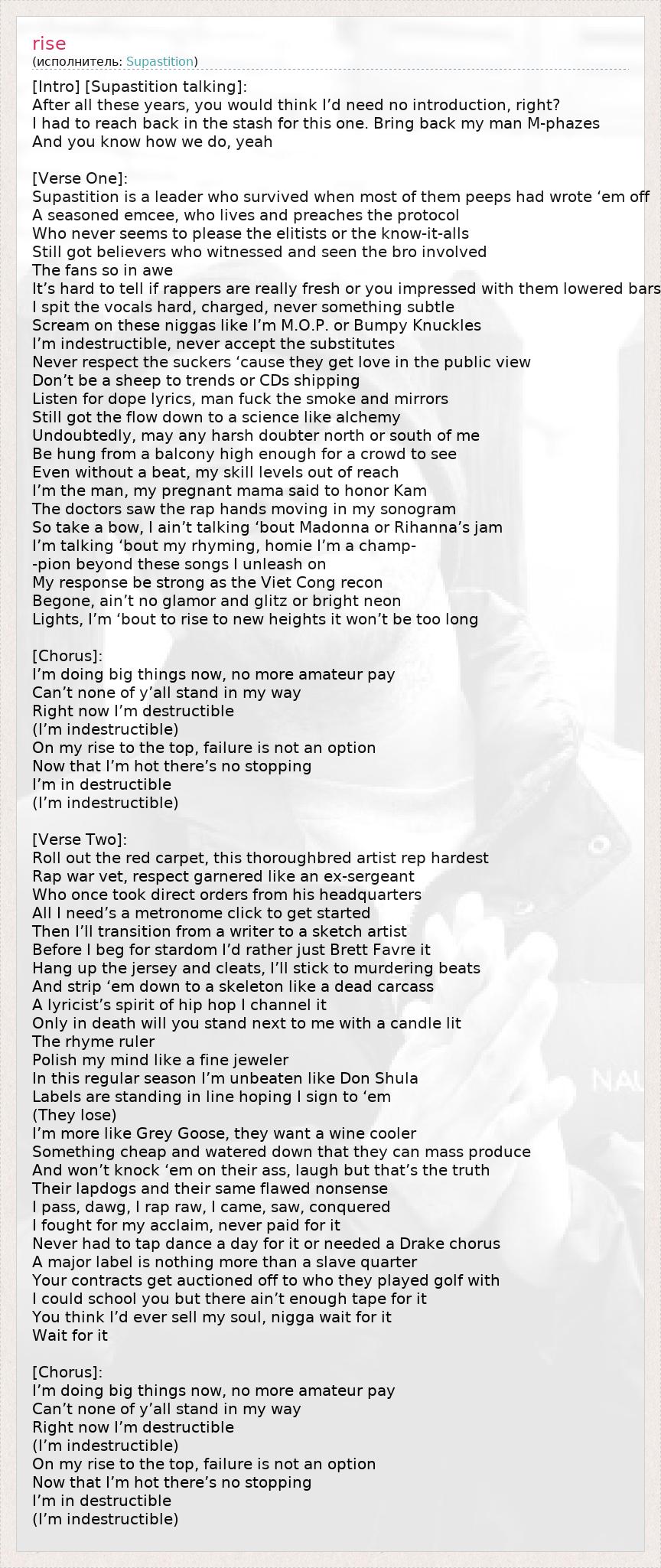 Это интересно:Supastition это MC из Greenville, North Carolina (в данном время он проживает в городе Charlotte).За свою карьеру ему удалось поработать с KRS-One, Cunninlynguists и Little Brother. У него есть 4 сольных альбома: 7 Years of Bad Luck (2002), The Deadline (2004), Chain Letters ( 2005) и альбом Splitting Image (2009) под псевдонимом Kam Moye.