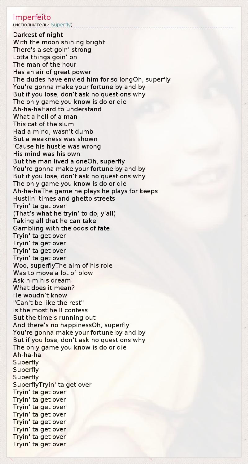 Darkest of night With the moon shining bright There's a set goin' strong Lotta things goin' on The man of the hour Has an air of great power The dudes have envied him for so longOh, superfly You're gonna make your fortune by and by But if you lose, don't ask no questions why The only game you know is do or die Ah-ha-haHard to understand What a hell of a man This cat of the slum Had a mind, wasn't dumb But a weakness was shown 'Cause his hustle was wrong His mind was his own But the man lived aloneOh, superfly You're gonna make your fortune by and by But if you lose, don't ask no questions why The only game you know is do or die Ah-ha-haThe game he plays he plays for keeps Hustlin' times and ghetto streets Tryin' ta get over (That's what he tryin' to do, y'all) Taking all that he can take Gambling with the odds of fate Tryin' ta get over Tryin' ta get over Tryin' ta get over Tryin' ta get over Woo, superflyThe aim of his role Was to move a lot of blow Ask him his dream What does it mean? He woudn't know "Can't be like the rest" Is the most he'll confess But the time's running out And there's no happinessOh, superfly You're gonna make your fortune by and by But if you lose, don't ask no questions why The only game you know is do or die Ah-ha-ha Superfly Superfly Superfly SuperflyTryin' ta get over Tryin' ta get over Tryin' ta get over Tryin' ta get over Tryin' ta get over Tryin' ta get over Tryin' ta get over Tryin' ta get over Tryin' ta get over