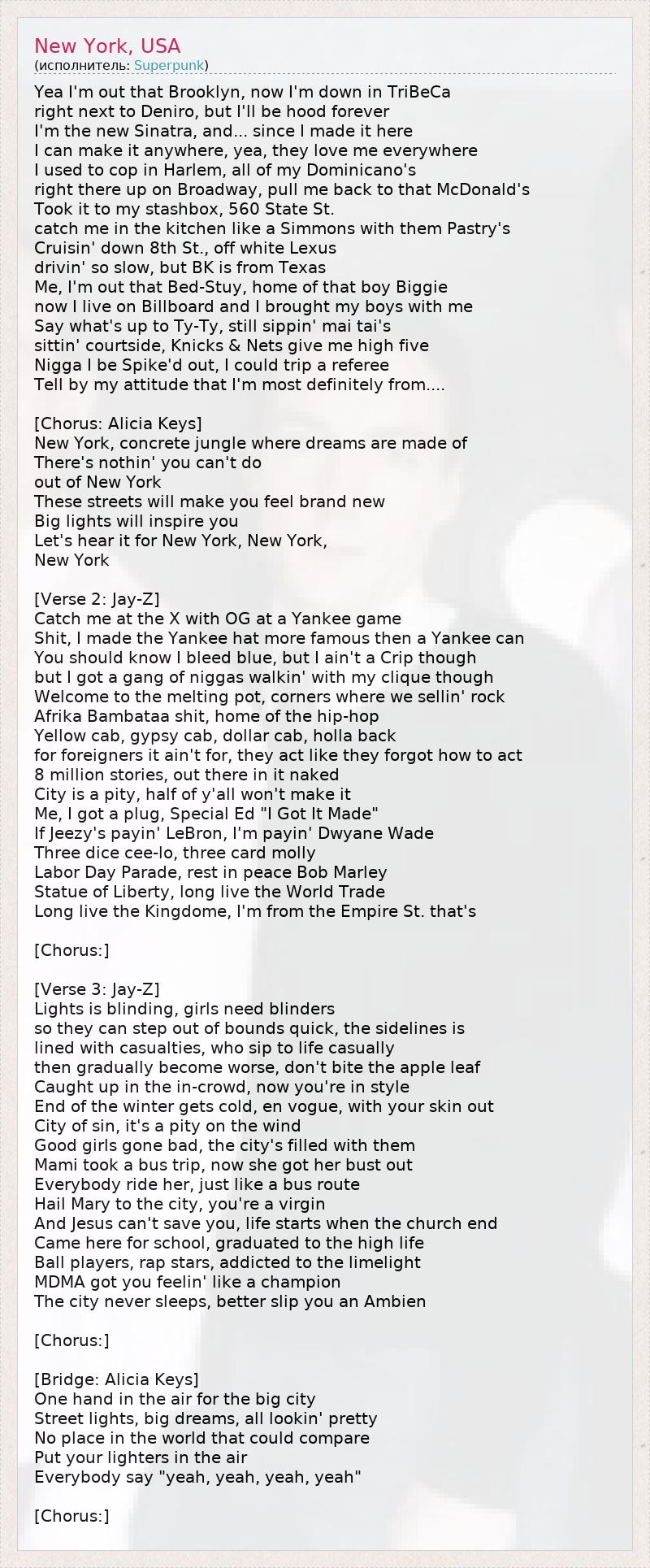 Yea I'm out that Brooklyn, now I'm down in TriBeCa right next to Deniro, but I'll be hood forever I'm the new Sinatra, and... since I made it here I can make it anywhere, yea, they love me everywhere I used to cop in Harlem, all of my Dominicano's right there up on Broadway, pull me back to that McDonald's Took it to my stashbox, 560 State St. catch me in the kitchen like a Simmons with them Pastry's Cruisin' down 8th St., off white Lexus drivin' so slow, but BK is from Texas Me, I'm out that Bed-Stuy, home of that boy Biggie now I live on Billboard and I brought my boys with me Say what's up to Ty-Ty, still sippin' mai tai's sittin' courtside, Knicks & Nets give me high five Nigga I be Spike'd out, I could trip a referee Tell by my attitude that I'm most definitely from.... [Chorus: Alicia Keys] New York, concrete jungle where dreams are made of There's nothin' you can't do out of New York These streets will make you feel brand new Big lights will inspire you Let's hear it for New York, New York, New York [Verse 2: Jay-Z] Catch me at the X with OG at a Yankee game Shit, I made the Yankee hat more famous then a Yankee can You should know I bleed blue, but I ain't a Crip though but I got a gang of niggas walkin' with my clique though Welcome to the melting pot, corners where we sellin' rock Afrika Bambataa shit, home of the hip-hop Yellow cab, gypsy cab, dollar cab, holla back for foreigners it ain't for, they act like they forgot how to act 8 million stories, out there in it naked City is a pity, half of y'all won't make it Me, I got a plug, Special Ed "I Got It Made" If Jeezy's payin' LeBron, I'm payin' Dwyane Wade Three dice cee-lo, three card molly Labor Day Parade, rest in peace Bob Marley Statue of Liberty, long live the World Trade Long live the Kingdome, I'm from the Empire St. that's [Chorus:] [Verse 3: Jay-Z] Lights is blinding, girls need blinders so they can step out of bounds quick, the sidelines is lined with casualties, who sip to life casually then gradually become worse, don't bite the apple leaf Caught up in the in-crowd, now you're in style End of the winter gets cold, en vogue, with your skin out City of sin, it's a pity on the wind Good girls gone bad, the city's filled with them Mami took a bus trip, now she got her bust out Everybody ride her, just like a bus route Hail Mary to the city, you're a virgin And Jesus can't save you, life starts when the church end Came here for school, graduated to the high life Ball players, rap stars, addicted to the limelight MDMA got you feelin' like a champion The city never sleeps, better slip you an Ambien [Chorus:] [Bridge: Alicia Keys] One hand in the air for the big city Street lights, big dreams, all lookin' pretty No place in the world that could compare Put your lighters in the air Everybody say "yeah, yeah, yeah, yeah" [Chorus:]