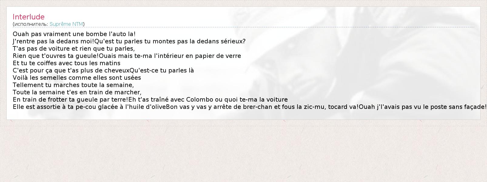 Ouah pas vraiment une bombe l'auto la! J'rentre pas la dedans moi!Qu'est tu parles tu montes pas la dedans sérieux? T'as pas de voiture et rien que tu parles, Rien que t'ouvres ta gueule!Ouais mais te-ma l'intérieur en papier de verre Et tu te coiffes avec tous les matins C'est pour ça que t'as plus de cheveuxQu'est-ce tu parles là Voilà les semelles comme elles sont usées Tellement tu marches toute la semaine, Toute la semaine t'es en train de marcher, En train de frotter ta gueule par terre!Eh t'as traîné avec Colombo ou quoi te-ma la voiture Elle est assortie à ta pe-cou glacée à l'huile d'oliveBon vas y vas y arrête de brer-chan et fous la zic-mu, tocard va!Ouah j'l'avais pas vu le poste sans façade!
