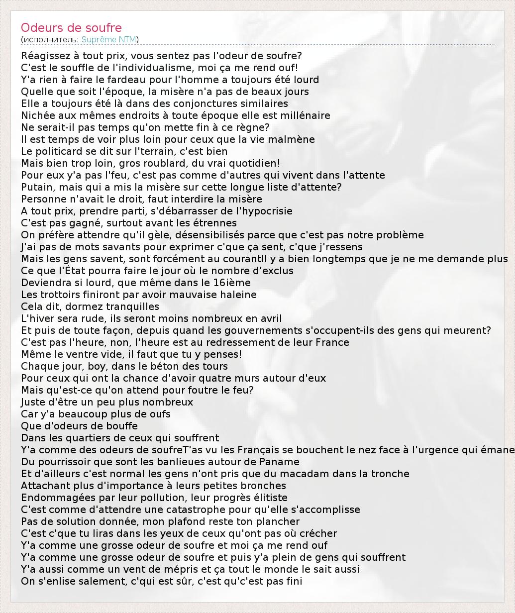 А как ты думаешь, о чем песня "Odeurs de soufre" ?