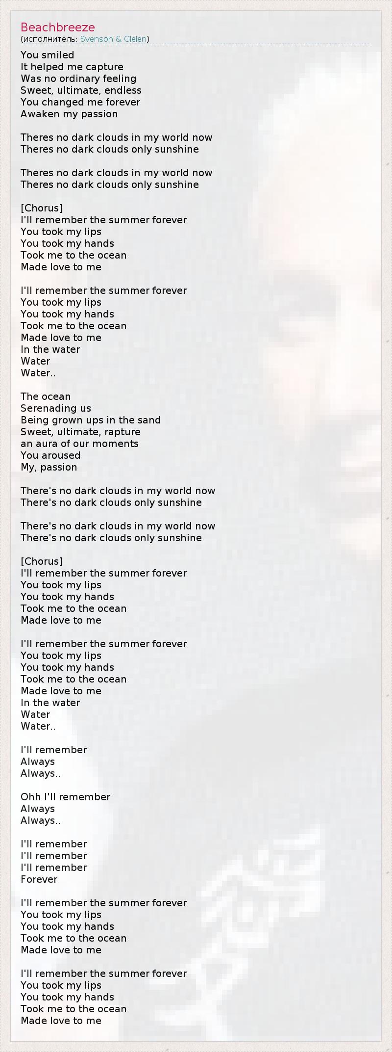 You smiled It helped me capture Was no ordinary feeling Sweet, ultimate, endless You changed me forever Awaken my passion Theres no dark clouds in my world now Theres no dark clouds only sunshine Theres no dark clouds in my world now Theres no dark clouds only sunshine [Chorus] I'll remember the summer forever You took my lips You took my hands Took me to the ocean Made love to me I'll remember the summer forever You took my lips You took my hands Took me to the ocean Made love to me In the water Water Water.. The ocean Serenading us Being grown ups in the sand Sweet, ultimate, rapture an aura of our moments You aroused My, passion There's no dark clouds in my world now There's no dark clouds only sunshine There's no dark clouds in my world now There's no dark clouds only sunshine [Chorus] I'll remember the summer forever You took my lips You took my hands Took me to the ocean Made love to me I'll remember the summer forever You took my lips You took my hands Took me to the ocean Made love to me In the water Water Water.. I'll remember Always Always.. Ohh I'll remember Always Always.. I'll remember I'll remember I'll remember Forever I'll remember the summer forever You took my lips You took my hands Took me to the ocean Made love to me I'll remember the summer forever You took my lips You took my hands Took me to the ocean Made love to me