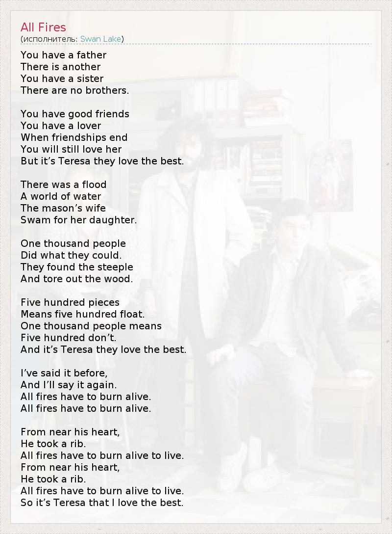 You have a father There is another You have a sister There are no brothers. You have good friends You have a lover When friendships end You will still love her But it’s Teresa they love the best. There was a flood A world of water The mason’s wife Swam for her daughter. One thousand people Did what they could. They found the steeple And tore out the wood. Five hundred pieces Means five hundred float. One thousand people means Five hundred don’t. And it’s Teresa they love the best. I’ve said it before, And I’ll say it again. All fires have to burn alive. All fires have to burn alive. From near his heart, He took a rib. All fires have to burn alive to live. From near his heart, He took a rib. All fires have to burn alive to live. So it’s Teresa that I love the best.