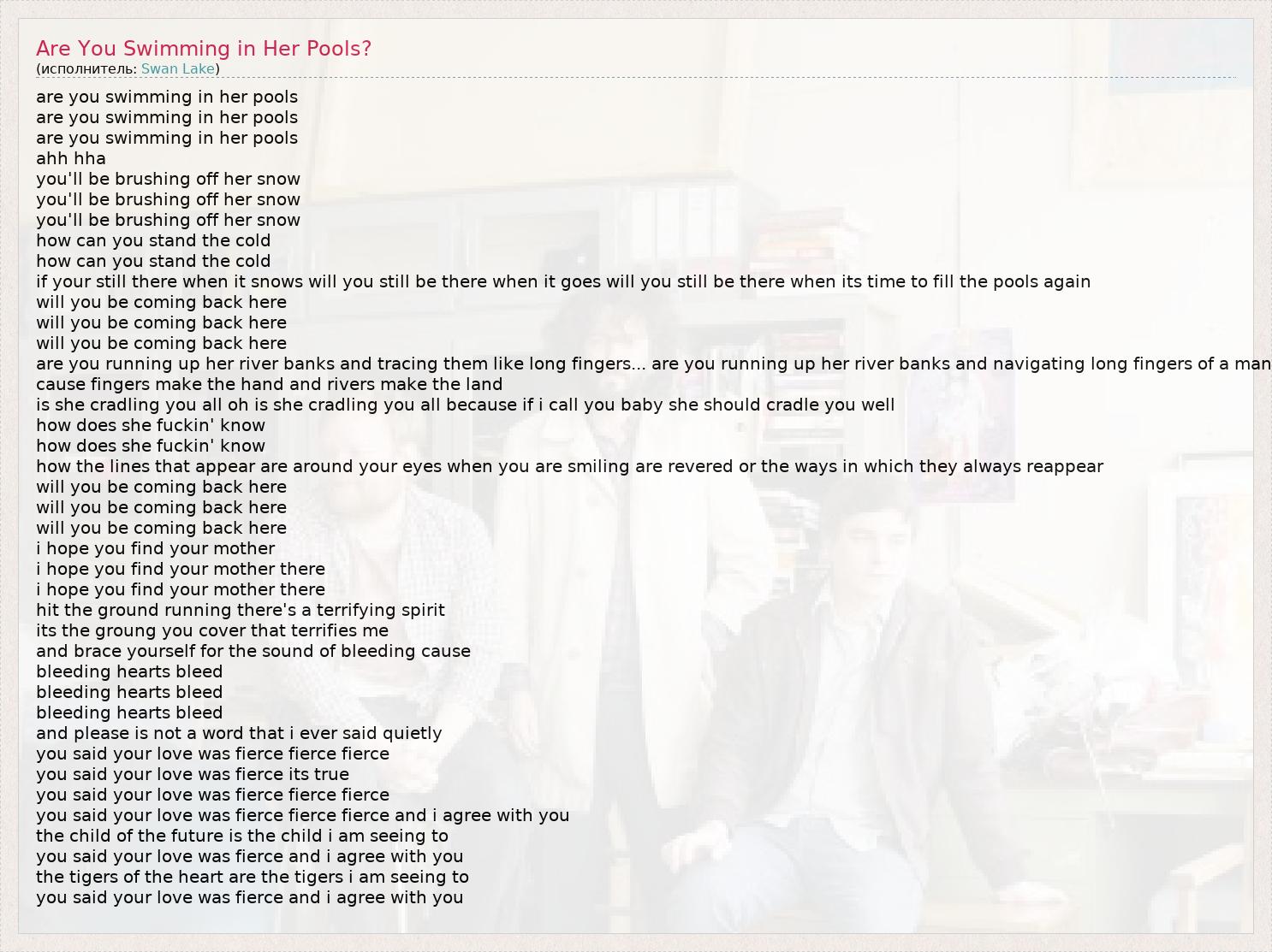 are you swimming in her pools are you swimming in her pools are you swimming in her pools ahh hha you'll be brushing off her snow you'll be brushing off her snow you'll be brushing off her snow how can you stand the cold how can you stand the cold if your still there when it snows will you still be there when it goes will you still be there when its time to fill the pools again will you be coming back here will you be coming back here will you be coming back here are you running up her river banks and tracing them like long fingers... are you running up her river banks and navigating long fingers of a man cause fingers make the hand and rivers make the land is she cradling you all oh is she cradling you all because if i call you baby she should cradle you well how does she fuckin' know how does she fuckin' know how the lines that appear are around your eyes when you are smiling are revered or the ways in which they always reappear will you be coming back here will you be coming back here will you be coming back here i hope you find your mother i hope you find your mother there i hope you find your mother there hit the ground running there's a terrifying spirit its the groung you cover that terrifies me and brace yourself for the sound of bleeding cause bleeding hearts bleed bleeding hearts bleed bleeding hearts bleed and please is not a word that i ever said quietly you said your love was fierce fierce fierce you said your love was fierce its true you said your love was fierce fierce fierce you said your love was fierce fierce fierce and i agree with you the child of the future is the child i am seeing to you said your love was fierce and i agree with you the tigers of the heart are the tigers i am seeing to you said your love was fierce and i agree with you