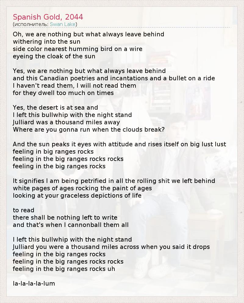 Oh, we are nothing but what always leave behind withering into the sun side color nearest humming bird on a wire eyeing the cloak of the sun Yes, we are nothing but what always leave behind and this Canadian poetries and incantations and a bullet on a ride I haven't read them, I will not read them for they dwell too much on times Yes, the desert is at sea and I left this bullwhip with the night stand Julliard was a thousand miles away Where are you gonna run when the clouds break? And the sun peaks it eyes with attitude and rises itself on big lust lust feeling in big ranges rocks feeling in the big ranges rocks rocks feeling in the big ranges rocks It signifies I am being petrified in all the rolling shit we left behind white pages of ages rocking the paint of ages looking at your graceless depictions of life to read there shall be nothing left to write and that's when I cannonball them all I left this bullwhip with the night stand Julliard you were a thousand miles across when you said it drops feeling in the big ranges rocks feeling in the big ranges rocks rocks feeling in the big ranges rocks uh la-la-la-la-lum