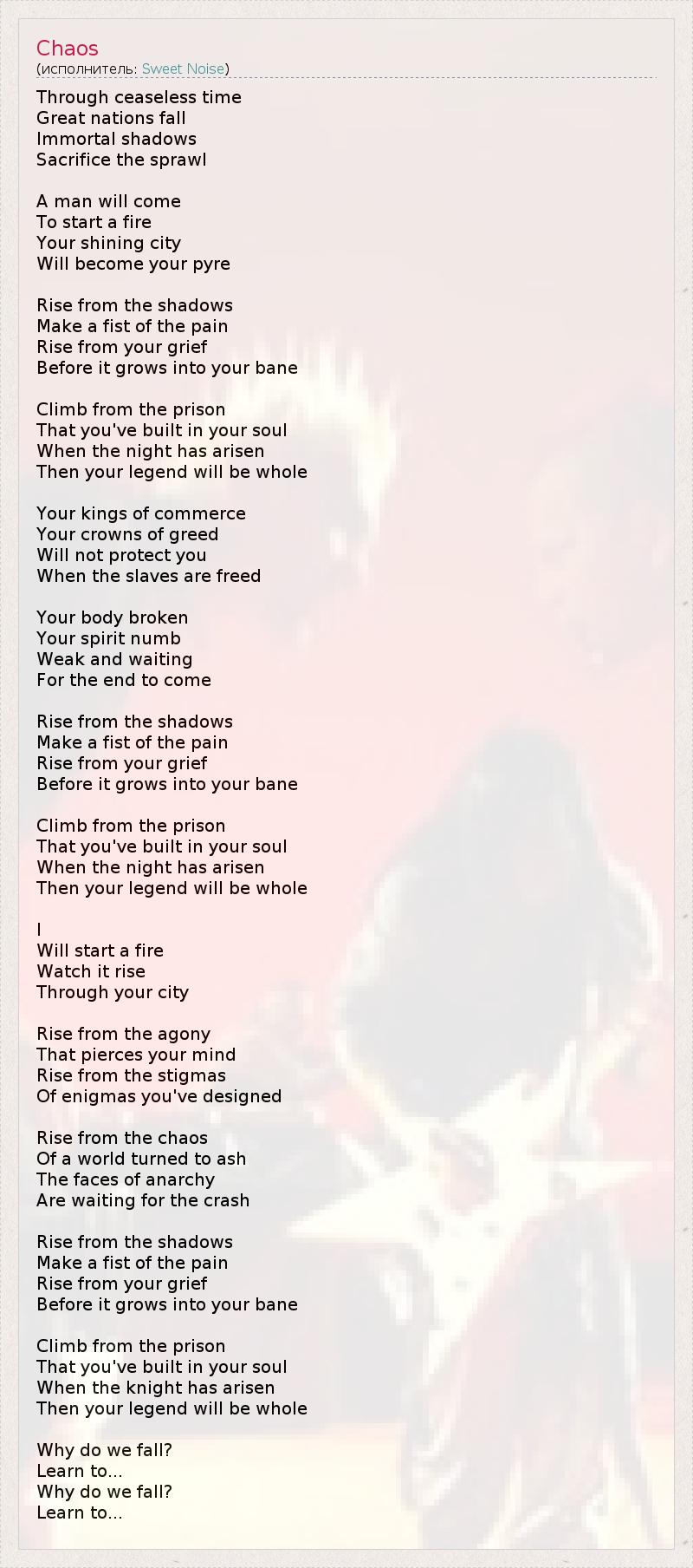 Бесчисленное количество раз Великие народы терпят поражение. Бессмертные тени Приносят в жертву целые города. 1 Человек придёт, Чтобы начать пожар. Твой сияющий город Станет погребальным костром для тебя. Восстань из теней, Сожми боль в кулак, Возвысься над своим горем, Пока оно не стало твоим проклятием. Сбеги из тюрьмы, Что ты воздвиг в своей душе, Когда настала ночь. Лишь тогда твоя история будет завершённой. Ваши короли коммерции, Ваши короны алчности Не спасут вас, Когда освободятся рабы. Твоё тело разбито, Душа оцепенела, Ты слаб и ждёшь, Когда настанет конец. Восстань из теней, Сожми боль в кулак, Возвысься над своим горем, Пока оно не стало твоим проклятием. Сбеги из тюрьмы, Что ты воздвиг в своей душе, Когда настала ночь. Лишь тогда твоя история будет завершённой. Я Устрою пожар, Буду смотреть, как он охватывает Твой город. Возвысься над агонией, Что пронзает твой разум, Возвысься над бесславием Тайн, что ты придумал. Восстань из хаоса мира, Обращённого в пепел. Лица анархии Ждут катастрофы... Восстань из теней, Сожми боль в кулак, Возвысься над своим горем, Пока оно не стало твоим проклятием. Сбеги из тюрьмы, Что ты воздвиг в своей душе, Когда настала ночь. Лишь тогда твоя история будет завершённой. Почему мы пали? Пойми... Почему мы пали? Пойми... 1 - сокр. от urban sprawl = рост городов, расползание города