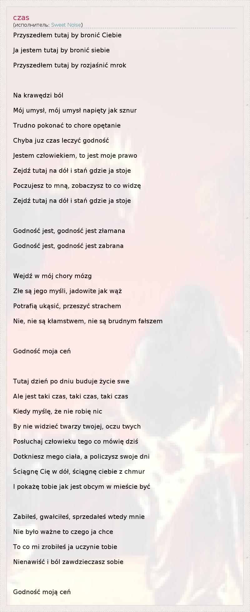 Przyszedłem tutaj by bronić Ciebie Ja jestem tutaj by bronić siebie Przyszedłem tutaj by rozjaśnić mrok Na krawędzi ból Mój umysł, mój umysł napięty jak sznur Trudno pokonać to chore opętanie Chyba juz czas leczyć godność Jestem człowiekiem, to jest moje prawo Zejdź tutaj na dół i stań gdzie ja stoje Poczujesz to mną, zobaczysz to co widzę Zejdź tutaj na dół i stań gdzie ja stoje Godność jest, godność jest złamana Godność jest, godność jest zabrana Wejdź w mój chory mózg Złe są jego myśli, jadowite jak wąż Potrafią ukąsić, przeszyć strachem Nie, nie są kłamstwem, nie są brudnym fałszem Godność moja ceń Tutaj dzień po dniu buduje życie swe Ale jest taki czas, taki czas, taki czas Kiedy myślę, że nie robię nic By nie widzieć twarzy twojej, oczu twych Posłuchaj człowieku tego co mówię dziś Dotkniesz mego ciała, a policzysz swoje dni Ściągnę Cię w dół, ściągnę ciebie z chmur I pokażę tobie jak jest obcym w mieście być Zabiłeś, gwałciłeś, sprzedałeś wtedy mnie Nie było ważne to czego ja chce To co mi zrobiłeś ja uczynie tobie Nienawiść i ból zawdzieczasz sobie Godność moją ceń
