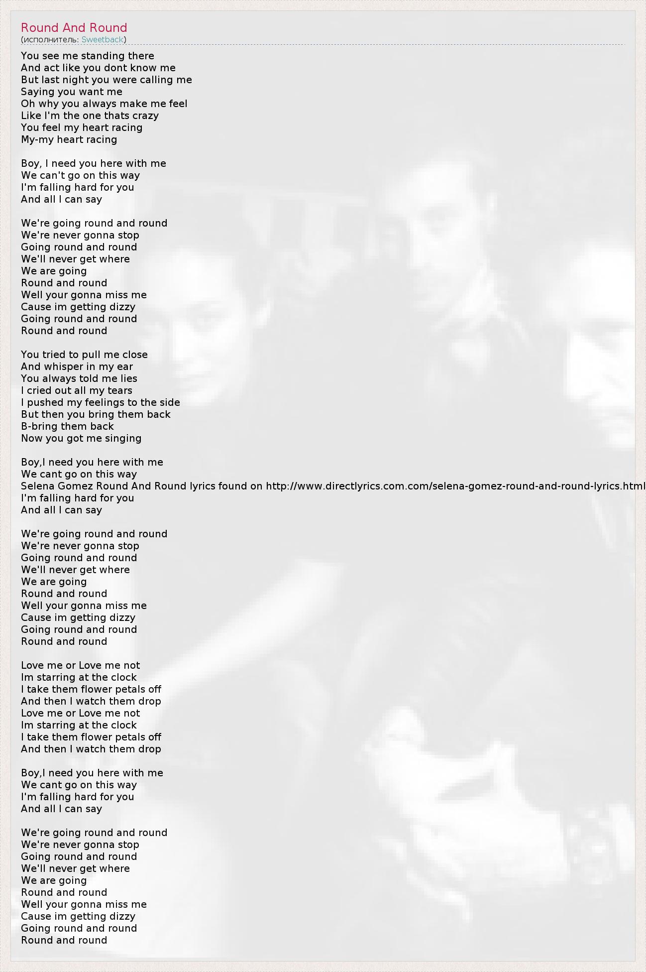You see me standing there And act like you dont know me But last night you were calling me Saying you want me Oh why you always make me feel Like I'm the one thats crazy You feel my heart racing My-my heart racing Boy, I need you here with me We can't go on this way I'm falling hard for you And all I can say We're going round and round We're never gonna stop Going round and round We'll never get where We are going Round and round Well your gonna miss me Cause im getting dizzy Going round and round Round and round You tried to pull me close And whisper in my ear You always told me lies I cried out all my tears I pushed my feelings to the side But then you bring them back B-bring them back Now you got me singing Boy,I need you here with me We cant go on this way Selena Gomez Round And Round lyrics found on http://www.directlyrics.com.com/selena-gomez-round-and-round-lyrics.html I'm falling hard for you And all I can say We're going round and round We're never gonna stop Going round and round We'll never get where We are going Round and round Well your gonna miss me Cause im getting dizzy Going round and round Round and round Love me or Love me not Im starring at the clock I take them flower petals off And then I watch them drop Love me or Love me not Im starring at the clock I take them flower petals off And then I watch them drop Boy,I need you here with me We cant go on this way I'm falling hard for you And all I can say We're going round and round We're never gonna stop Going round and round We'll never get where We are going Round and round Well your gonna miss me Cause im getting dizzy Going round and round Round and round