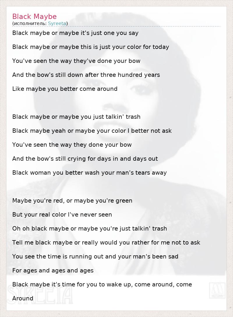 Black maybe or maybe it's just one you say Black maybe or maybe this is just your color for today You've seen the way they've done your bow And the bow's still down after three hundred years Like maybe you better come around Black maybe or maybe you just talkin' trash Black maybe yeah or maybe your color I better not ask You've seen the way they done your bow And the bow's still crying for days in and days out Black woman you better wash your man's tears away Maybe you're red, or maybe you're green But your real color l've never seen Oh oh black maybe or maybe you're just talkin' trash Tell me black maybe or really would you rather for me not to ask You see the time is running out and your man's been sad For ages and ages and ages Black maybe it's time for you to wake up, come around, come Around