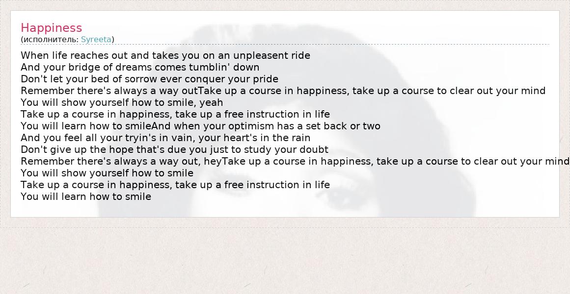 When life reaches out and takes you on an unpleasent ride And your bridge of dreams comes tumblin' down Don't let your bed of sorrow ever conquer your pride Remember there's always a way outTake up a course in happiness, take up a course to clear out your mind You will show yourself how to smile, yeah Take up a course in happiness, take up a free instruction in life You will learn how to smileAnd when your optimism has a set back or two And you feel all your tryin's in vain, your heart's in the rain Don't give up the hope that's due you just to study your doubt Remember there's always a way out, heyTake up a course in happiness, take up a course to clear out your mind You will show yourself how to smile Take up a course in happiness, take up a free instruction in life You will learn how to smile