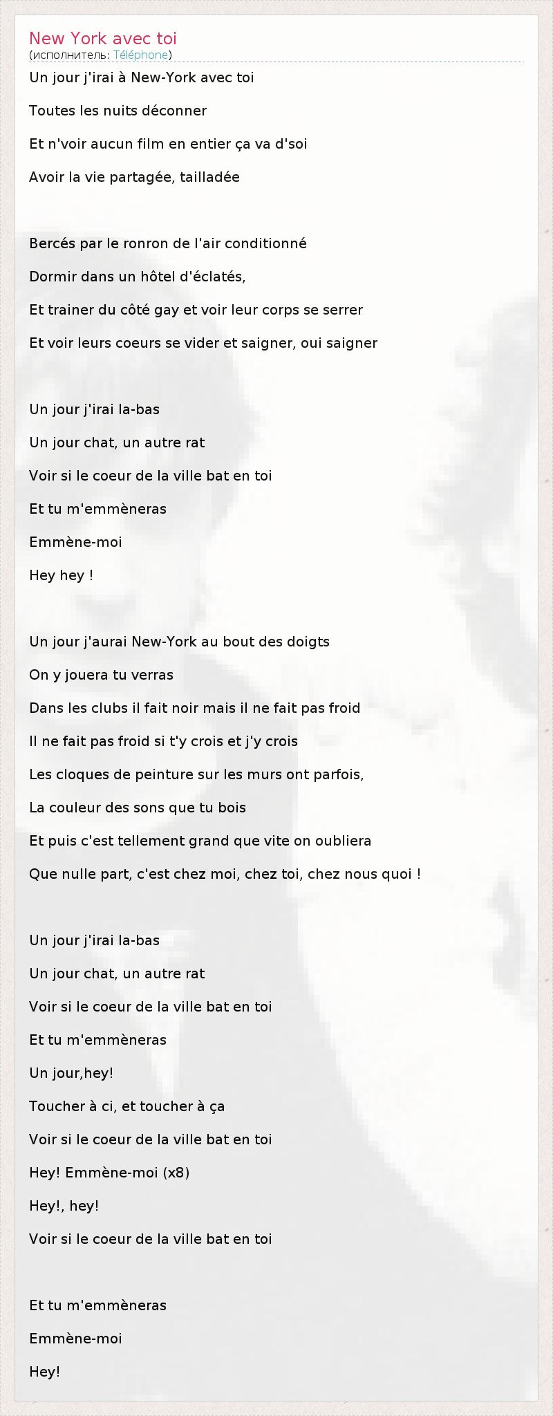 Un jour j'irai à New-York avec toi Toutes les nuits déconner Et n'voir aucun film en entier ça va d'soi Avoir la vie partagée, tailladée Bercés par le ronron de l'air conditionné Dormir dans un hôtel d'éclatés, Et trainer du côté gay et voir leur corps se serrer Et voir leurs coeurs se vider et saigner, oui saigner Un jour j'irai la-bas Un jour chat, un autre rat Voir si le coeur de la ville bat en toi Et tu m'emmèneras Emmène-moi Hey hey ! Un jour j'aurai New-York au bout des doigts On y jouera tu verras Dans les clubs il fait noir mais il ne fait pas froid Il ne fait pas froid si t'y crois et j'y crois Les cloques de peinture sur les murs ont parfois, La couleur des sons que tu bois Et puis c'est tellement grand que vite on oubliera Que nulle part, c'est chez moi, chez toi, chez nous quoi ! Un jour j'irai la-bas Un jour chat, un autre rat Voir si le coeur de la ville bat en toi Et tu m'emmèneras Un jour,hey! Toucher à ci, et toucher à ça Voir si le coeur de la ville bat en toi Hey! Emmène-moi (x8) Hey!, hey! Voir si le coeur de la ville bat en toi Et tu m'emmèneras Emmène-moi Hey!