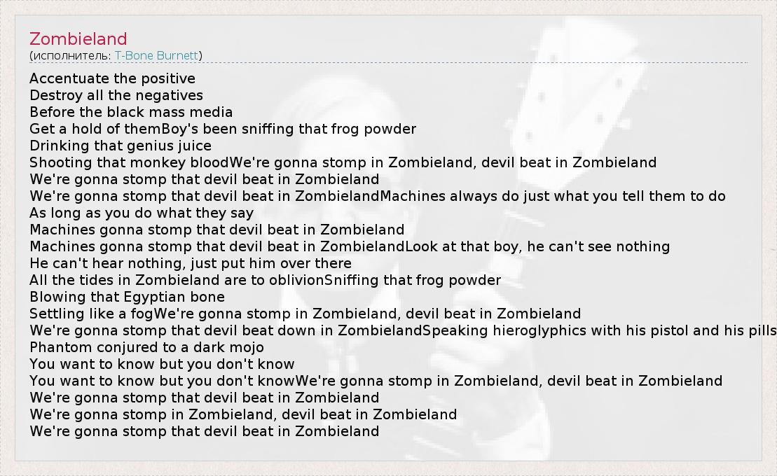 Settling like a fogWe're gonna stomp in Zombieland, devil beat in Zombieland