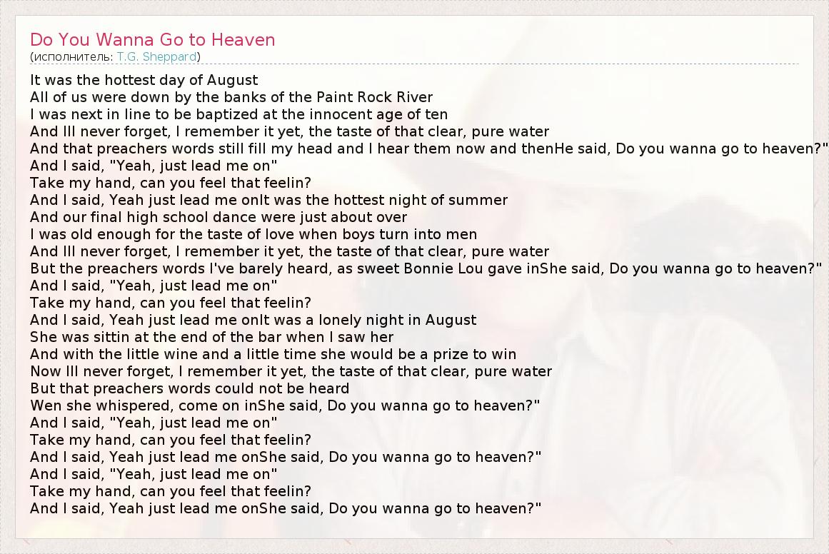 It was the hottest day of August All of us were down by the banks of the Paint Rock River I was next in line to be baptized at the innocent age of ten And Ill never forget, I remember it yet, the taste of that clear, pure water And that preachers words still fill my head and I hear them now and thenHe said, Do you wanna go to heaven?" And I said, "Yeah, just lead me on" Take my hand, can you feel that feelin? And I said, Yeah just lead me onIt was the hottest night of summer And our final high school dance were just about over I was old enough for the taste of love when boys turn into men And Ill never forget, I remember it yet, the taste of that clear, pure water But the preachers words I've barely heard, as sweet Bonnie Lou gave inShe said, Do you wanna go to heaven?" And I said, "Yeah, just lead me on" Take my hand, can you feel that feelin? And I said, Yeah just lead me onIt was a lonely night in August She was sittin at the end of the bar when I saw her And with the little wine and a little time she would be a prize to win Now Ill never forget, I remember it yet, the taste of that clear, pure water But that preachers words could not be heard Wen she whispered, come on inShe said, Do you wanna go to heaven?" And I said, "Yeah, just lead me on" Take my hand, can you feel that feelin? And I said, Yeah just lead me onShe said, Do you wanna go to heaven?" And I said, "Yeah, just lead me on" Take my hand, can you feel that feelin? And I said, Yeah just lead me onShe said, Do you wanna go to heaven?"