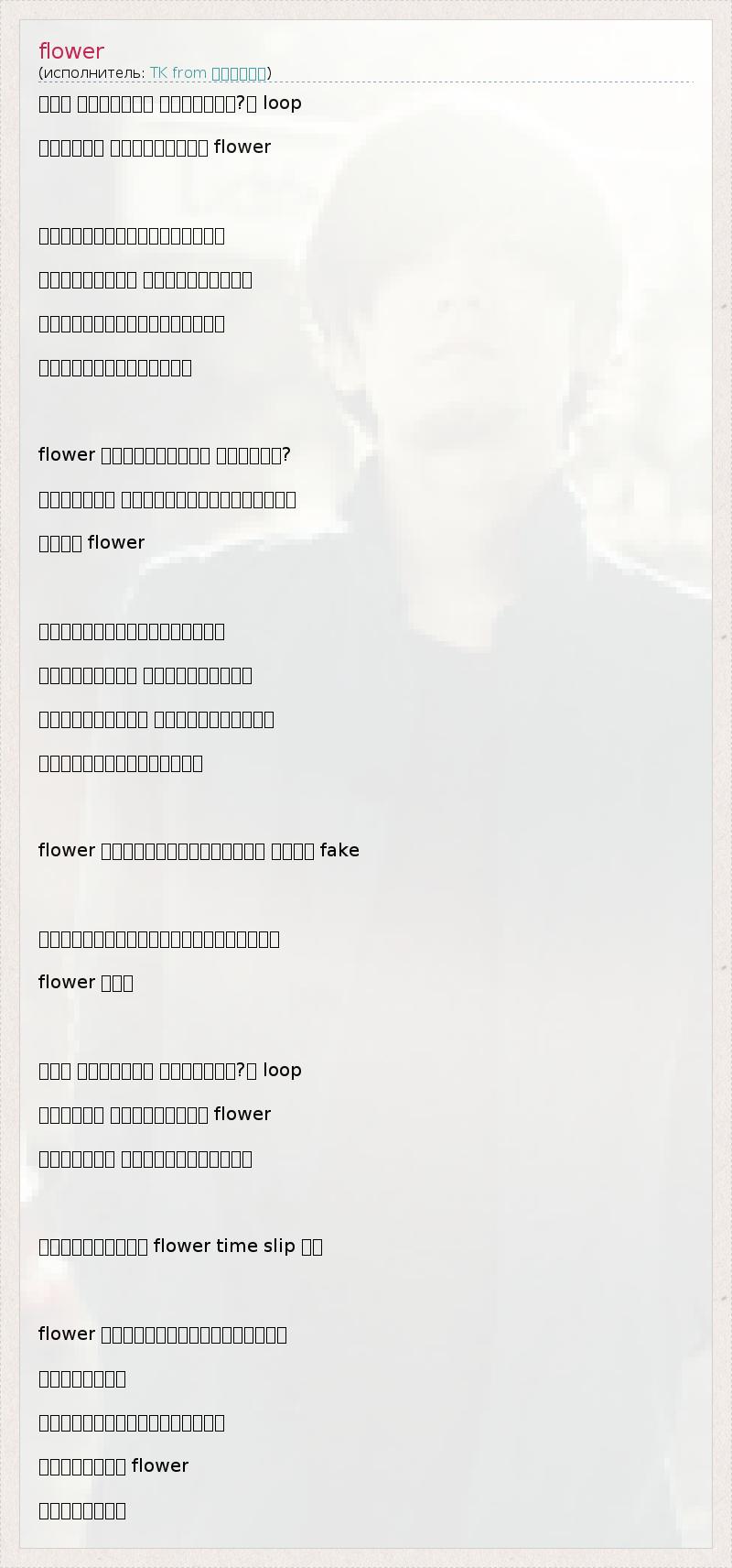 寂しさ 鼓膜が涙する音 僕はそこにいる?が loop ぐるぐる記憶 モノクロを満たして flower 自分を殺す魔法で僕は息を止めている 笑ったこともないし 耳だって塞がれている でも光を探して僕に気付かれない様に 記憶の色も変わって君に会えた flower 落としてきた夢並べて まだ咲くかな? 壊れないように フィルムレスフラッシュバックする ぐるぐる flower 自分を殺す魔法で僕は息を止めている 笑ったこともないし 耳だって塞がれている イツカへの窓を開けて 僕を散りばめてみたいな 色んなものが笑ってキミに会えた flower モノクロのパズルに色をつけたら 鮮やかな fake 僅かな曖昧さが美しく見えるのは君に触れるまで flower 教えて 寂しさ 鼓膜が涙する音 僕はそこにいる?が loop ぐるぐる記憶 モノクロを満たして flower 魔法に溢れてる 僕に潜むプラスチック錯覚 プラスチックめいてる flower time slip 現象 flower カラフルな世界を夢見て生きてるから 終らせたくないよ 誰かが待ってる気がして生きてるだけ プラスチック錯覚 flower 終らせたくないよ