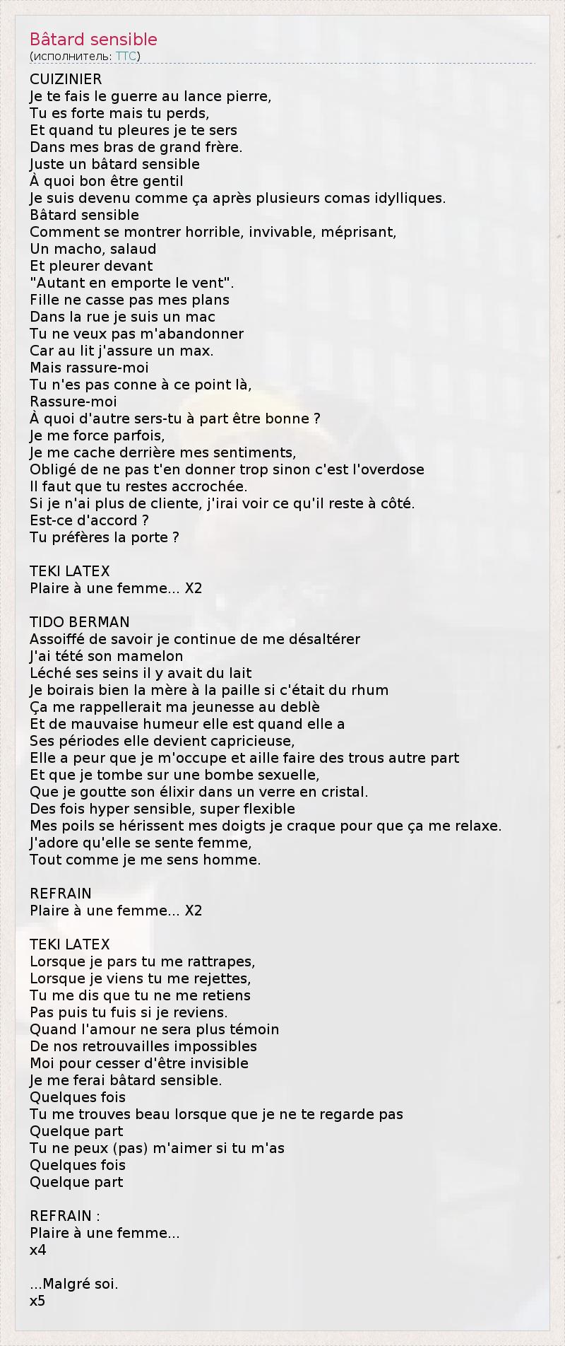 CUIZINIER Je те Fais ле гер Au копье Пьер, Tu Es форте Mais Вт perds , Et Quand Ту pleures Je Te ГКР Dans мес бюстгальтеры де Гранд frère . Жюст ООН Batard разумным À Quoi Bon существования Жантиль Je суис devenu Comme Ca апре plusieurs запятые idylliques . Batard разумным Комментарий SE montrer ужасное , invivable , méprisant , Un мачо, salaud Et pleurer Devant и Quot; Унесённые ветром и Quot ;. Дочь пе Casse па МЧС планы Dans La Rue Je Suis ООН Mac Ту пе Veux Pas m'abandonner Автомобиль Au горит j'assure ип макс. Mais rassure - Moi Ту n'es па Conne СЕ точки Л.А., Rassure - Moi À Quoi d' Autre ГКР -тучасть существования Bonne ? Je мне силы Parfois , Je мне кэш Derriere МЧС настроения , Обязать определим па Тьен Доннер Trop Sinon c'est l' передозировки Il Faut Que Tu restes accrochée . Si JE n'ai плюс -де- Cliente , j'irai ВОИР CE qu'il Reste à Коте . Est -CE D'Accord ? Ту préfères La Porte ? Teki LATEX Plaire à ипе фам ... X2 Тидо BERMAN Assoiffé де ноу- JE -прежнему де мне désaltérer J'ai Тете сын мамелонов Лече SES Seins IL у avait дю молоком Je boirais Bien -ла- mère ля Paille си c'était дю Rhum Ча ме rappellerait ма Jeunesse Au deblè ET DE mauvaise humeur Elle EST Quand Elle Ses périodes Elle devient capricieuse , EllePeur Que JE m'occupe и др aille свободной конкуренции де закиси Autre часть Et Que JE могилы сюр UNE Бомба sexuelle , Que JE ГОУТТЕ сын эликсир данс ип VERRE EN Cristal . Des фуа гипер чувствительная, супер гибкий Mes poils себе hérissent мес Doigts JE craque залить Que ча ме Relaxe . J'adore qu'elle себе сенте Femme , Tout Comme JE мне тя Homme . ВОЗДЕРЖИВАЮТСЯ Plaire à ипе фам ... X2 Teki LATEX Lorsque JE Парс Tü мне rattrapes , Lorsque JE VIENS вт меня rejettes , Ту я дис Que Tu пе мне retiens Pas Puis Ту fuis şi Je Reviens . Quand L'Amour пе сыворотки плюс témoin Де- NOS retrouvailles impossibles Мой залить cesser d' être невидимым Je меня ferai Batard разумным. Quelques фуа- Ту я trouves кавалер lorsque Que JE NE те Regarde па Quelque часть Ту пе peux (PAS) m'aimer си Вт m'as Quelques фуа- Quelque часть Припев : Plaire à ипе фам ... x4 ... Malgré СОИ. x5