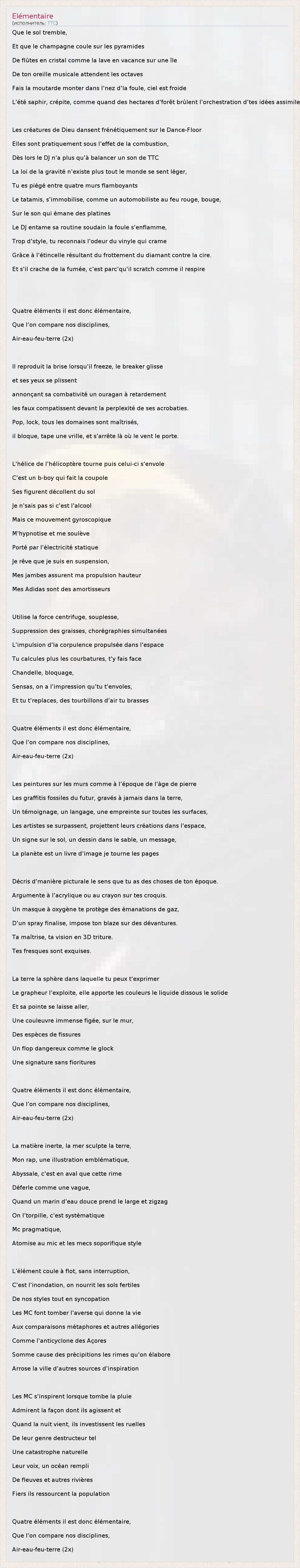 Que le sol tremble, Et que le champagne coule sur les pyramides De flûtes en cristal comme la lave en vacance sur une île De ton oreille musicale attendent les octaves Fais la moutarde monter dans l'nez d'la foule, ciel est froide L'été saphir, crépite, comme quand des hectares d'forêt brûlent l'orchestration d'tes idées assimile Les créatures de Dieu dansent frénétiquement sur le Dance-Floor Elles sont pratiquement sous l'effet de la combustion, Dès lors le DJ n'a plus qu'à balancer un son de TTC La loi de la gravité n'existe plus tout le monde se sent léger, Tu es piégé entre quatre murs flamboyants Le tatamis, s'immobilise, comme un automobiliste au feu rouge, bouge, Sur le son qui émane des platines Le DJ entame sa routine soudain la foule s'enflamme, Trop d'style, tu reconnais l'odeur du vinyle qui crame Grâce à l'étincelle résultant du frottement du diamant contre la cire. Et s'il crache de la fumée, c'est parc'qu'il scratch comme il respire Quatre éléments il est donc élémentaire, Que l'on compare nos disciplines, Air-eau-feu-terre (2x) Il reproduit la brise lorsqu'il freeze, le breaker glisse et ses yeux se plissent annonçant sa combativité un ouragan à retardement les faux compatissent devant la perplexité de ses acrobaties. Pop, lock, tous les domaines sont maîtrisés, il bloque, tape une vrille, et s'arrête là où le vent le porte. L'hélice de l'hélicoptère tourne puis celui-ci s'envole C'est un b-boy qui fait la coupole Ses figurent décollent du sol Je n'sais pas si c'est l'alcool Mais ce mouvement gyroscopique M'hypnotise et me soulève Porté par l'électricité statique Je rêve que je suis en suspension, Mes jambes assurent ma propulsion hauteur Mes Adidas sont des amortisseurs Utilise la force centrifuge, souplesse, Suppression des graisses, chorégraphies simultanées L'impulsion d'la corpulence propulsée dans l'espace Tu calcules plus les courbatures, t'y fais face Chandelle, bloquage, Sensas, on a l'impression qu'tu t'envoles, Et tu t'replaces, des tourbillons d'air tu brasses Quatre éléments il est donc élémentaire, Que l'on compare nos disciplines, Air-eau-feu-terre (2x) Les peintures sur les murs comme à l'époque de l'âge de pierre Les graffitis fossiles du futur, gravés à jamais dans la terre, Un témoignage, un langage, une empreinte sur toutes les surfaces, Les artistes se surpassent, projettent leurs créations dans l'espace, Un signe sur le sol, un dessin dans le sable, un message, La planète est un livre d'image je tourne les pages Décris d'manière picturale le sens que tu as des choses de ton époque. Argumente à l'acrylique ou au crayon sur tes croquis. Un masque à oxygène te protège des émanations de gaz, D'un spray finalise, impose ton blaze sur des dévantures. Ta maîtrise, ta vision en 3D triture. Tes fresques sont exquises. La terre la sphère dans laquelle tu peux t'exprimer Le grapheur l'exploite, elle apporte les couleurs le liquide dissous le solide Et sa pointe se laisse aller, Une couleuvre immense figée, sur le mur, Des espèces de fissures Un flop dangereux comme le glock Une signature sans fioritures Quatre éléments il est donc élémentaire, Que l'on compare nos disciplines, Air-eau-feu-terre (2x) La matière inerte, la mer sculpte la terre, Mon rap, une illustration emblématique, Abyssale, c'est en aval que cette rime Déferle comme une vague, Quand un marin d'eau douce prend le large et zigzag On l'torpille, c'est systématique Mc pragmatique, Atomise au mic et les mecs soporifique style L’élément coule à flot, sans interruption, C'est l'inondation, on nourrit les sols fertiles De nos styles tout en syncopation Les MC font tomber l'averse qui donne la vie Aux comparaisons métaphores et autres allégories Comme l'anticyclone des Açores Somme cause des précipitions les rimes qu'on élabore Arrose la ville d'autres sources d'inspiration Les MC s'inspirent lorsque tombe la pluie Admirent la façon dont ils agissent et Quand la nuit vient, ils investissent les ruelles De leur genre destructeur tel Une catastrophe naturelle Leur voix, un océan rempli De fleuves et autres rivières Fiers ils ressourcent la population Quatre éléments il est donc élémentaire, Que l'on compare nos disciplines, Air-eau-feu-terre (2x)