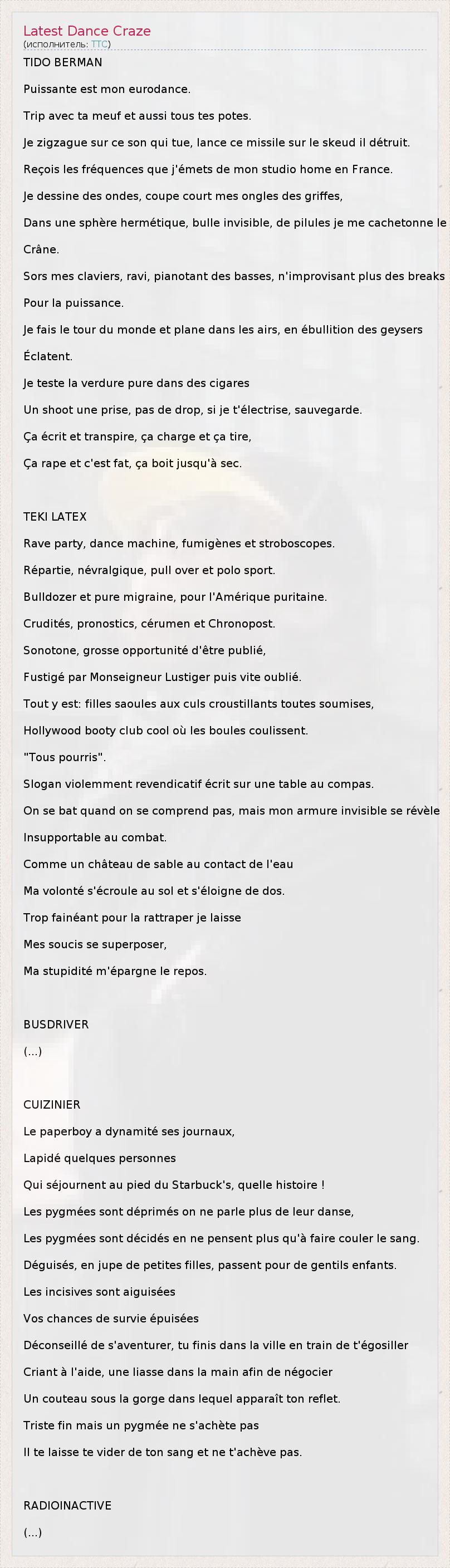 TIDO BERMAN Puissante est mon eurodance. Trip avec ta meuf et aussi tous tes potes. Je zigzague sur ce son qui tue, lance ce missile sur le skeud il détruit. Reçois les fréquences que j'émets de mon studio home en France. Je dessine des ondes, coupe court mes ongles des griffes, Dans une sphère hermétique, bulle invisible, de pilules je me cachetonne le Crâne. Sors mes claviers, ravi, pianotant des basses, n'improvisant plus des breaks Pour la puissance. Je fais le tour du monde et plane dans les airs, en ébullition des geysers Éclatent. Je teste la verdure pure dans des cigares Un shoot une prise, pas de drop, si je t'électrise, sauvegarde. Ça écrit et transpire, ça charge et ça tire, Ça rape et c'est fat, ça boit jusqu'à sec. TEKI LATEX Rave party, dance machine, fumigènes et stroboscopes. Répartie, névralgique, pull over et polo sport. Bulldozer et pure migraine, pour l'Amérique puritaine. Crudités, pronostics, cérumen et Chronopost. Sonotone, grosse opportunité d'être publié, Fustigé par Monseigneur Lustiger puis vite oublié. Tout y est: filles saoules aux culs croustillants toutes soumises, Hollywood booty club cool où les boules coulissent. "Tous pourris". Slogan violemment revendicatif écrit sur une table au compas. On se bat quand on se comprend pas, mais mon armure invisible se révèle Insupportable au combat. Comme un château de sable au contact de l'eau Ma volonté s'écroule au sol et s'éloigne de dos. Trop fainéant pour la rattraper je laisse Mes soucis se superposer, Ma stupidité m'épargne le repos. BUSDRIVER (...) CUIZINIER Le paperboy a dynamité ses journaux, Lapidé quelques personnes Qui séjournent au pied du Starbuck's, quelle histoire ! Les pygmées sont déprimés on ne parle plus de leur danse, Les pygmées sont décidés en ne pensent plus qu'à faire couler le sang. Déguisés, en jupe de petites filles, passent pour de gentils enfants. Les incisives sont aiguisées Vos chances de survie épuisées Déconseillé de s'aventurer, tu finis dans la ville en train de t'égosiller Criant à l'aide, une liasse dans la main afin de négocier Un couteau sous la gorge dans lequel apparaît ton reflet. Triste fin mais un pygmée ne s'achète pas Il te laisse te vider de ton sang et ne t'achève pas. RADIOINACTIVE (...)
