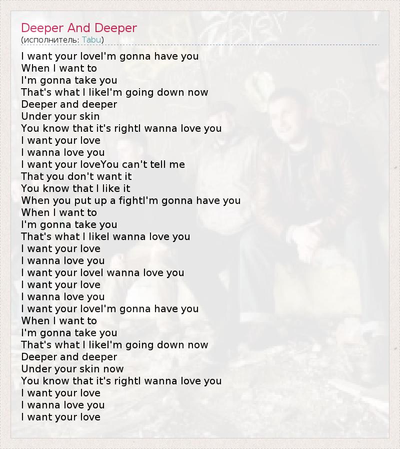 I want your loveI'm gonna have you When I want to I'm gonna take you That's what I likeI'm going down now Deeper and deeper Under your skin You know that it's rightI wanna love you I want your love I wanna love you I want your loveYou can't tell me That you don't want it You know that I like it When you put up a fightI'm gonna have you When I want to I'm gonna take you That's what I likeI wanna love you I want your love I wanna love you I want your loveI wanna love you I want your love I wanna love you I want your loveI'm gonna have you When I want to I'm gonna take you That's what I likeI'm going down now Deeper and deeper Under your skin now You know that it's rightI wanna love you I want your love I wanna love you I want your love