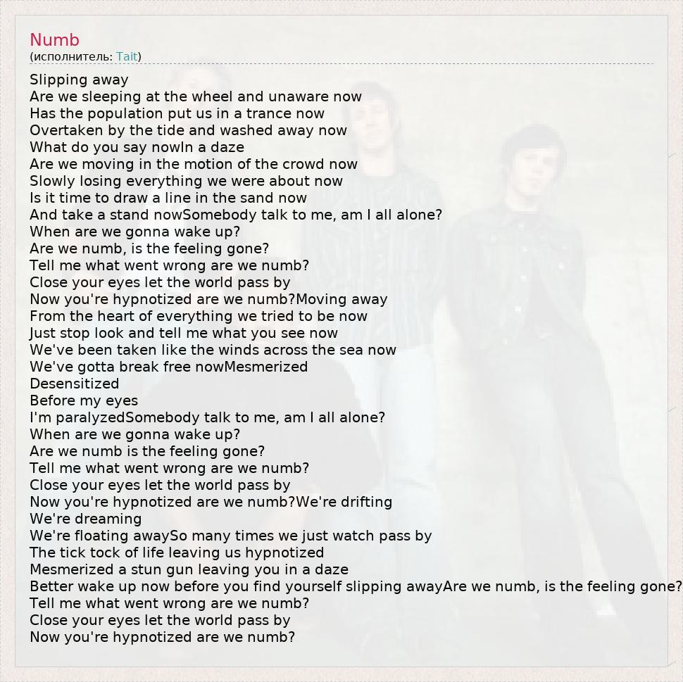 Better wake up now before you find yourself slipping awayAre we numb, is the feeling gone?