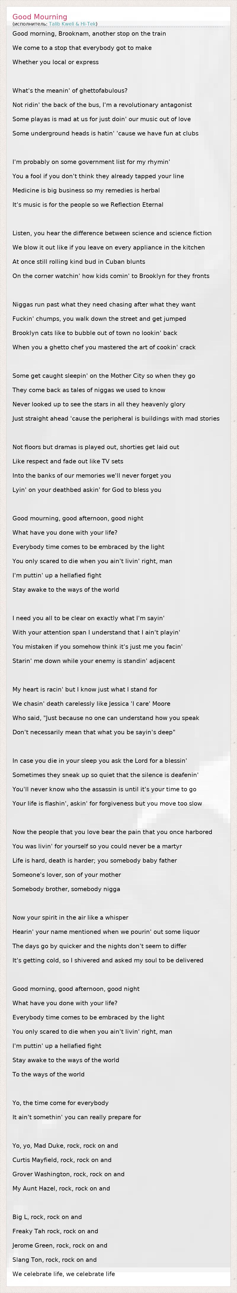 Good morning, Brooknam, another stop on the train We come to a stop that everybody got to make Whether you local or express What's the meanin' of ghettofabulous? Not ridin' the back of the bus, I'm a revolutionary antagonist Some playas is mad at us for just doin' our music out of love Some underground heads is hatin' 'cause we have fun at clubs I'm probably on some government list for my rhymin' You a fool if you don't think they already tapped your line Medicine is big business so my remedies is herbal It's music is for the people so we Reflection Eternal Listen, you hear the difference between science and science fiction We blow it out like if you leave on every appliance in the kitchen At once still rolling kind bud in Cuban blunts On the corner watchin' how kids comin' to Brooklyn for they fronts Niggas run past what they need chasing after what they want Fuckin' chumps, you walk down the street and get jumped Brooklyn cats like to bubble out of town no lookin' back When you a ghetto chef you mastered the art of cookin' crack Some get caught sleepin' on the Mother City so when they go They come back as tales of niggas we used to know Never looked up to see the stars in all they heavenly glory Just straight ahead 'cause the peripheral is buildings with mad stories Not floors but dramas is played out, shorties get laid out Like respect and fade out like TV sets Into the banks of our memories we'll never forget you Lyin' on your deathbed askin' for God to bless you Good mourning, good afternoon, good night What have you done with your life? Everybody time comes to be embraced by the light You only scared to die when you ain't livin' right, man I'm puttin' up a hellafied fight Stay awake to the ways of the world I need you all to be clear on exactly what I'm sayin' With your attention span I understand that I ain't playin' You mistaken if you somehow think it's just me you facin' Starin' me down while your enemy is standin' adjacent My heart is racin' but I know just what I stand for We chasin' death carelessly like Jessica 'I care' Moore Who said, "Just because no one can understand how you speak Don't necessarily mean that what you be sayin's deep" In case you die in your sleep you ask the Lord for a blessin' Sometimes they sneak up so quiet that the silence is deafenin' You'll never know who the assassin is until it's your time to go Your life is flashin', askin' for forgiveness but you move too slow Now the people that you love bear the pain that you once harbored You was livin' for yourself so you could never be a martyr Life is hard, death is harder; you somebody baby father Someone's lover, son of your mother Somebody brother, somebody nigga Now your spirit in the air like a whisper Hearin' your name mentioned when we pourin' out some liquor The days go by quicker and the nights don't seem to differ It's getting cold, so I shivered and asked my soul to be delivered Good morning, good afternoon, good night What have you done with your life? Everybody time comes to be embraced by the light You only scared to die when you ain't livin' right, man I'm puttin' up a hellafied fight Stay awake to the ways of the world To the ways of the world Yo, the time come for everybody It ain't somethin' you can really prepare for Yo, yo, Mad Duke, rock, rock on and Curtis Mayfield, rock, rock on and Grover Washington, rock, rock on and My Aunt Hazel, rock, rock on and Big L, rock, rock on and Freaky Tah rock, rock on and Jerome Green, rock, rock on and Slang Ton, rock, rock on and We celebrate life, we celebrate life