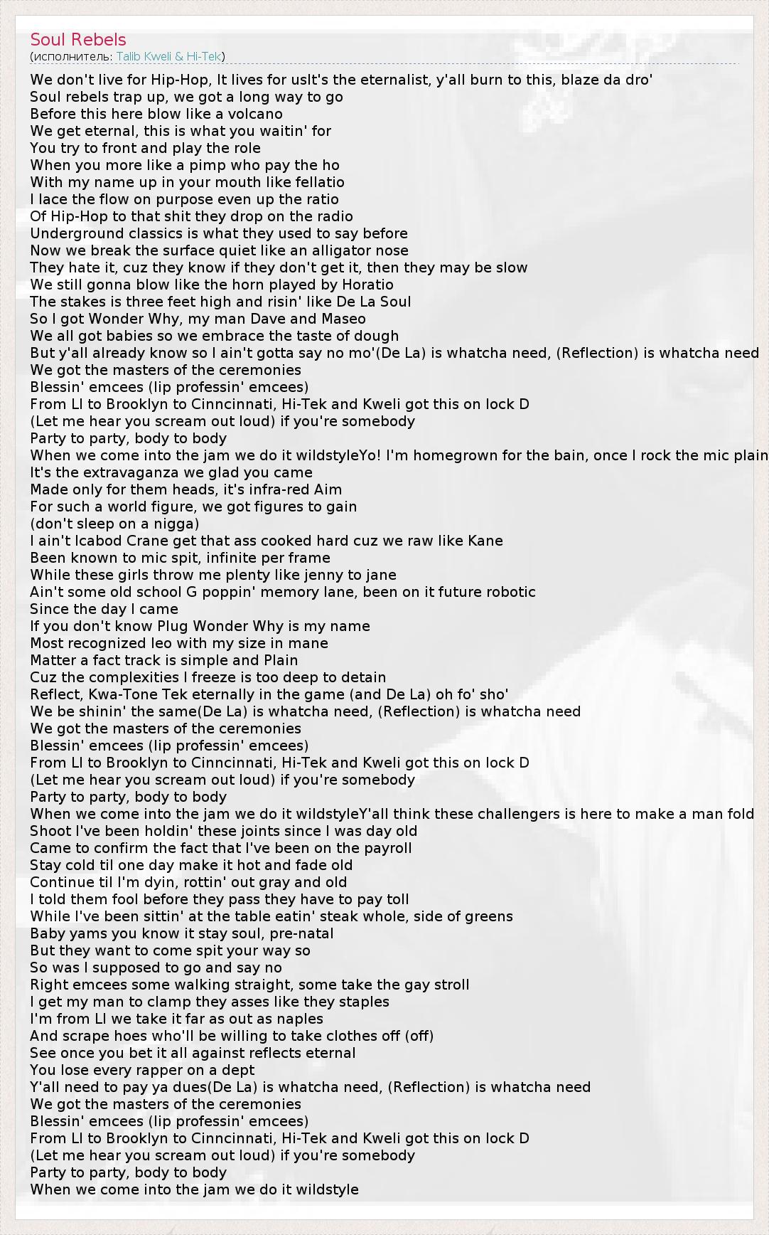 We don't live for Hip-Hop, It lives for usIt's the eternalist, y'all burn to this, blaze da dro' Soul rebels trap up, we got a long way to go Before this here blow like a volcano We get eternal, this is what you waitin' for You try to front and play the role When you more like a pimp who pay the ho With my name up in your mouth like fellatio I lace the flow on purpose even up the ratio Of Hip-Hop to that shit they drop on the radio Underground classics is what they used to say before Now we break the surface quiet like an alligator nose They hate it, cuz they know if they don't get it, then they may be slow We still gonna blow like the horn played by Horatio The stakes is three feet high and risin' like De La Soul So I got Wonder Why, my man Dave and Maseo We all got babies so we embrace the taste of dough But y'all already know so I ain't gotta say no mo'(De La) is whatcha need, (Reflection) is whatcha need We got the masters of the ceremonies Blessin' emcees (lip professin' emcees) From LI to Brooklyn to Cinncinnati, Hi-Tek and Kweli got this on lock D (Let me hear you scream out loud) if you're somebody Party to party, body to body When we come into the jam we do it wildstyleYo! I'm homegrown for the bain, once I rock the mic plain It's the extravaganza we glad you came Made only for them heads, it's infra-red Aim For such a world figure, we got figures to gain (don't sleep on a nigga) I ain't Icabod Crane get that ass cooked hard cuz we raw like Kane Been known to mic spit, infinite per frame While these girls throw me plenty like jenny to jane Ain't some old school G poppin' memory lane, been on it future robotic Since the day I came If you don't know Plug Wonder Why is my name Most recognized leo with my size in mane Matter a fact track is simple and Plain Cuz the complexities I freeze is too deep to detain Reflect, Kwa-Tone Tek eternally in the game (and De La) oh fo' sho' We be shinin' the same(De La) is whatcha need, (Reflection) is whatcha need We got the masters of the ceremonies Blessin' emcees (lip professin' emcees) From LI to Brooklyn to Cinncinnati, Hi-Tek and Kweli got this on lock D (Let me hear you scream out loud) if you're somebody Party to party, body to body When we come into the jam we do it wildstyleY'all think these challengers is here to make a man fold Shoot I've been holdin' these joints since I was day old Came to confirm the fact that I've been on the payroll Stay cold til one day make it hot and fade old Continue til I'm dyin, rottin' out gray and old I told them fool before they pass they have to pay toll While I've been sittin' at the table eatin' steak whole, side of greens Baby yams you know it stay soul, pre-natal But they want to come spit your way so So was I supposed to go and say no Right emcees some walking straight, some take the gay stroll I get my man to clamp they asses like they staples I'm from LI we take it far as out as naples And scrape hoes who'll be willing to take clothes off (off) See once you bet it all against reflects eternal You lose every rapper on a dept Y'all need to pay ya dues(De La) is whatcha need, (Reflection) is whatcha need We got the masters of the ceremonies Blessin' emcees (lip professin' emcees) From LI to Brooklyn to Cinncinnati, Hi-Tek and Kweli got this on lock D (Let me hear you scream out loud) if you're somebody Party to party, body to body When we come into the jam we do it wildstyle
