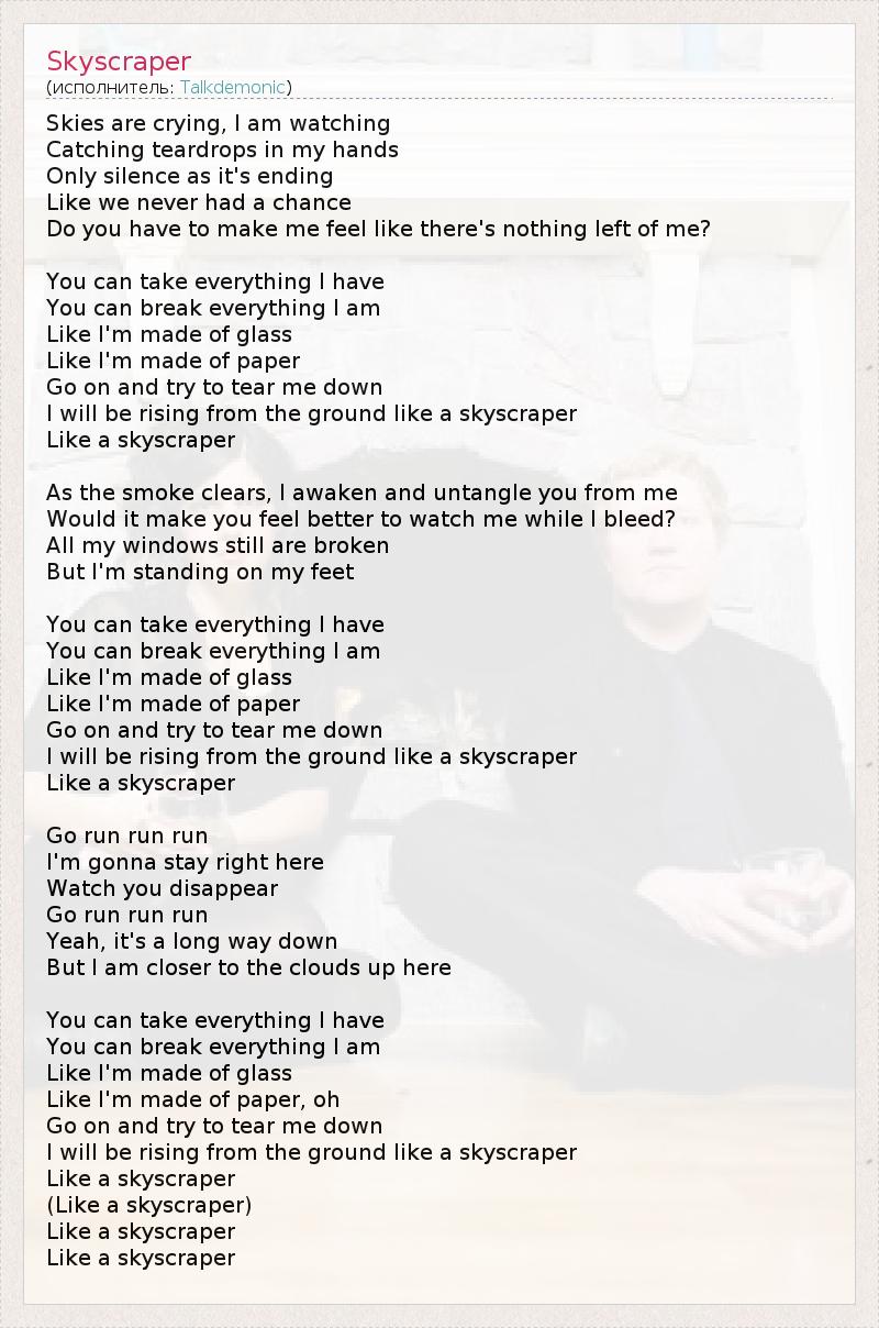 Skies are crying, I am watching Catching teardrops in my hands Only silence as it's ending Like we never had a chance Do you have to make me feel like there's nothing left of me? You can take everything I have You can break everything I am Like I'm made of glass Like I'm made of paper Go on and try to tear me down I will be rising from the ground like a skyscraper Like a skyscraper As the smoke clears, I awaken and untangle you from me Would it make you feel better to watch me while I bleed? All my windows still are broken But I'm standing on my feet You can take everything I have You can break everything I am Like I'm made of glass Like I'm made of paper Go on and try to tear me down I will be rising from the ground like a skyscraper Like a skyscraper Go run run run I'm gonna stay right here Watch you disappear Go run run run Yeah, it's a long way down But I am closer to the clouds up here You can take everything I have You can break everything I am Like I'm made of glass Like I'm made of paper, oh Go on and try to tear me down I will be rising from the ground like a skyscraper Like a skyscraper (Like a skyscraper) Like a skyscraper Like a skyscraper