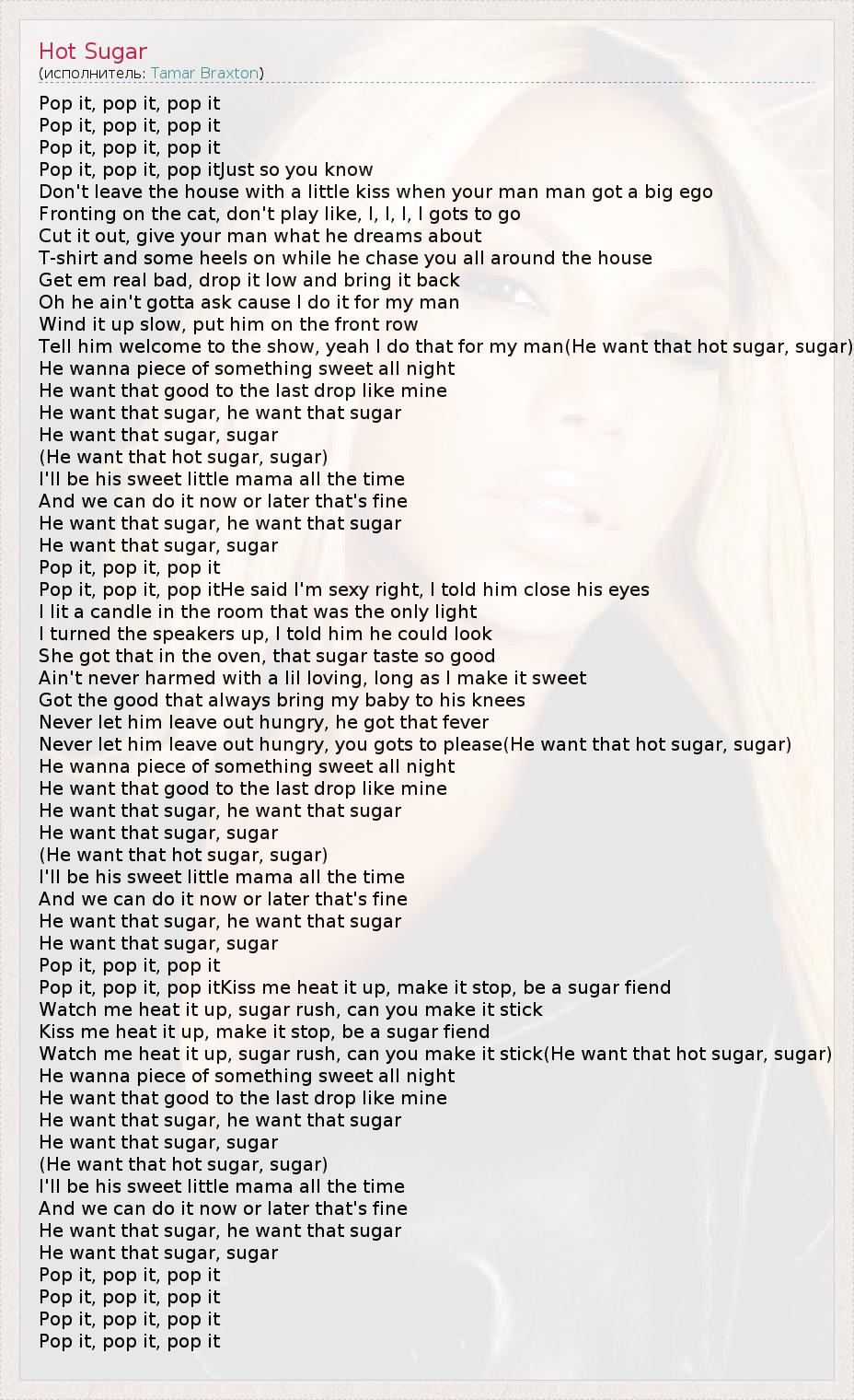 Pop it, pop it, pop it Pop it, pop it, pop it Pop it, pop it, pop it Pop it, pop it, pop itJust so you know Don't leave the house with a little kiss when your man man got a big ego Fronting on the cat, don't play like, I, I, I, I gots to go Cut it out, give your man what he dreams about T-shirt and some heels on while he chase you all around the house Get em real bad, drop it low and bring it back Oh he ain't gotta ask cause I do it for my man Wind it up slow, put him on the front row Tell him welcome to the show, yeah I do that for my man(He want that hot sugar, sugar) He wanna piece of something sweet all night He want that good to the last drop like mine He want that sugar, he want that sugar He want that sugar, sugar (He want that hot sugar, sugar) I'll be his sweet little mama all the time And we can do it now or later that's fine He want that sugar, he want that sugar He want that sugar, sugar Pop it, pop it, pop it Pop it, pop it, pop itHe said I'm sexy right, I told him close his eyes I lit a candle in the room that was the only light I turned the speakers up, I told him he could look She got that in the oven, that sugar taste so good Ain't never harmed with a lil loving, long as I make it sweet Got the good that always bring my baby to his knees Never let him leave out hungry, he got that fever Never let him leave out hungry, you gots to please(He want that hot sugar, sugar) He wanna piece of something sweet all night He want that good to the last drop like mine He want that sugar, he want that sugar He want that sugar, sugar (He want that hot sugar, sugar) I'll be his sweet little mama all the time And we can do it now or later that's fine He want that sugar, he want that sugar He want that sugar, sugar Pop it, pop it, pop it Pop it, pop it, pop itKiss me heat it up, make it stop, be a sugar fiend Watch me heat it up, sugar rush, can you make it stick Kiss me heat it up, make it stop, be a sugar fiend Watch me heat it up, sugar rush, can you make it stick(He want that hot sugar, sugar) He wanna piece of something sweet all night He want that good to the last drop like mine He want that sugar, he want that sugar He want that sugar, sugar (He want that hot sugar, sugar) I'll be his sweet little mama all the time And we can do it now or later that's fine He want that sugar, he want that sugar He want that sugar, sugar Pop it, pop it, pop it Pop it, pop it, pop it Pop it, pop it, pop it Pop it, pop it, pop it