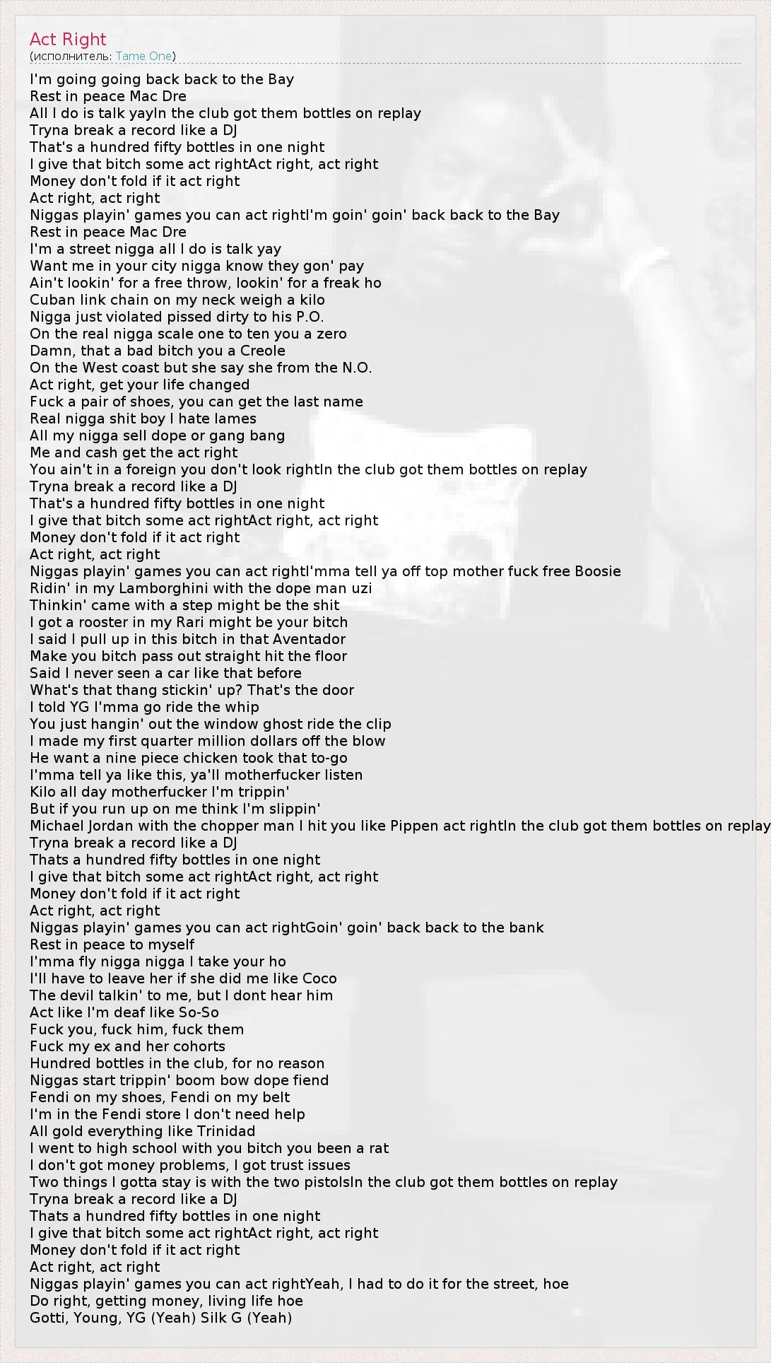 Это интересно:Rahem Brown, более известный под сценическим именем Tame One, андеграунд рэпер из Нью Джерси, 1/2 группы Artifacts, хип-хоп дуэта с El Da Sensei. Так же известен коллаборацией с Cage'ом, называющейся Leak Bros. Кроме того, Tame One входит в состав супер-группы Weathermen (Aesop Rock, Breeze Brewin, Cage, El-P,... продолжение