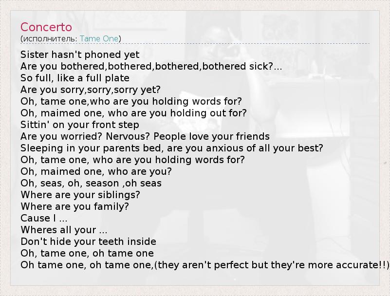 Это интересно:Rahem Brown, более известный под сценическим именем Tame One, андеграунд рэпер из Нью Джерси, 1/2 группы Artifacts, хип-хоп дуэта с El Da Sensei. Так же известен коллаборацией с Cage'ом, называющейся Leak Bros. Кроме того, Tame One входит в состав супер-группы Weathermen (Aesop Rock, Breeze Brewin, Cage, El-P,... продолжение