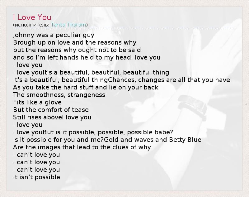 Johnny was a peculiar guy Brough up on love and the reasons why but the reasons why ought not to be said and so I'm left hands held to my headI love you I love you I love youIt's a beautiful, beautiful, beautiful thing It's a beautiful, beautiful thingChances, changes are all that you have As you take the hard stuff and lie on your back The smoothness, strangeness Fits like a glove But the comfort of tease Still rises aboveI love you I love you I love youBut is it possible, possible, possible babe? Is it possible for you and me?Gold and waves and Betty Blue Are the images that lead to the clues of why I can't love you I can't love you I can't love you It isn't possible