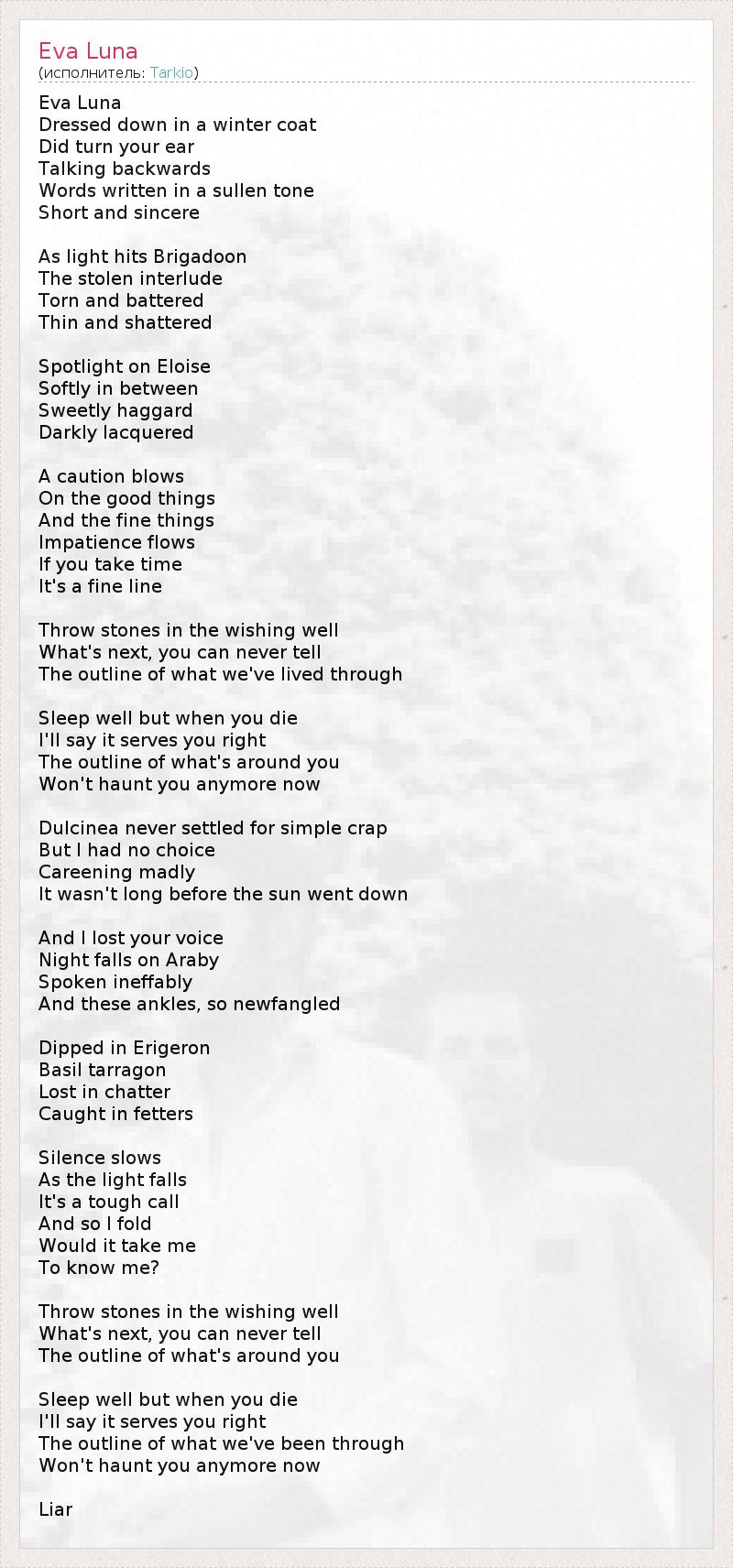 Eva Luna Dressed down in a winter coat Did turn your ear Talking backwards Words written in a sullen tone Short and sincere As light hits Brigadoon The stolen interlude Torn and battered Thin and shattered Spotlight on Eloise Softly in between Sweetly haggard Darkly lacquered A caution blows On the good things And the fine things Impatience flows If you take time It's a fine line Throw stones in the wishing well What's next, you can never tell The outline of what we've lived through Sleep well but when you die I'll say it serves you right The outline of what's around you Won't haunt you anymore now Dulcinea never settled for simple crap But I had no choice Careening madly It wasn't long before the sun went down And I lost your voice Night falls on Araby Spoken ineffably And these ankles, so newfangled Dipped in Erigeron Basil tarragon Lost in chatter Caught in fetters Silence slows As the light falls It's a tough call And so I fold Would it take me To know me? Throw stones in the wishing well What's next, you can never tell The outline of what's around you Sleep well but when you die I'll say it serves you right The outline of what we've been through Won't haunt you anymore now Liar