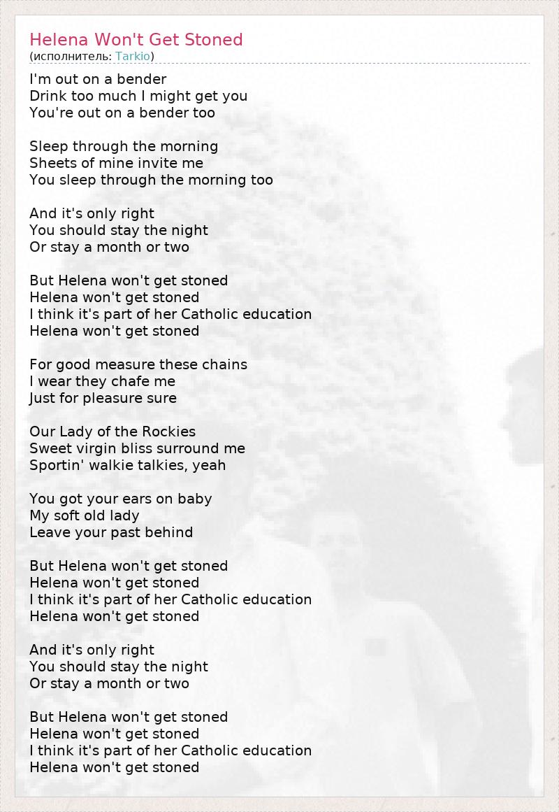 I'm out on a bender Drink too much I might get you You're out on a bender too Sleep through the morning Sheets of mine invite me You sleep through the morning too And it's only right You should stay the night Or stay a month or two But Helena won't get stoned Helena won't get stoned I think it's part of her Catholic education Helena won't get stoned For good measure these chains I wear they chafe me Just for pleasure sure Our Lady of the Rockies Sweet virgin bliss surround me Sportin' walkie talkies, yeah You got your ears on baby My soft old lady Leave your past behind But Helena won't get stoned Helena won't get stoned I think it's part of her Catholic education Helena won't get stoned And it's only right You should stay the night Or stay a month or two But Helena won't get stoned Helena won't get stoned I think it's part of her Catholic education Helena won't get stoned