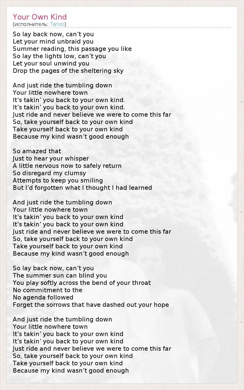So lay back now, can’t you Let your mind unbraid you Summer reading, this passage you like So lay the lights low, can’t you Let your soul unwind you Drop the pages of the sheltering sky And just ride the tumbling down Your little nowhere town It’s takin’ you back to your own kind. It’s takin’ you back to your own kind. Just ride and never believe we were to come this far So, take yourself back to your own kind Take yourself back to your own kind Because my kind wasn’t good enough So amazed that Just to hear your whisper A little nervous now to safely return So disregard my clumsy Attempts to keep you smiling But I’d forgotten what I thought I had learned And just ride the tumbling down Your little nowhere town It’s takin’ you back to your own kind It’s takin’ you back to your own kind Just ride and never believe we were to come this far So, take yourself back to your own kind Take yourself back to your own kind Because my kind wasn’t good enough So lay back now, can’t you The summer sun can blind you You play softly across the bend of your throat No commitment to the No agenda followed Forget the sorrows that have dashed out your hope And just ride the tumbling down Your little nowhere town It’s takin’ you back to your own kind It’s takin’ you back to your own kind Just ride and never believe we were to come this far So, take yourself back to your own kind Take yourself back to your own kind Because my kind wasn’t good enough
