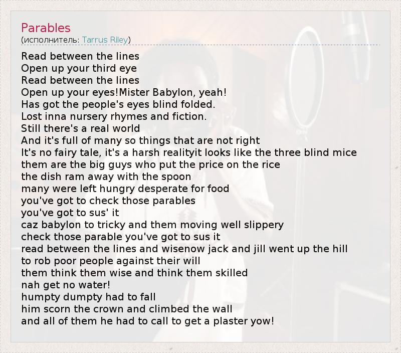 Read between the lines Open up your third eye Read between the lines Open up your eyes!Mister Babylon, yeah! Has got the people's eyes blind folded. Lost inna nursery rhymes and fiction. Still there's a real world And it's full of many so things that are not right It's no fairy tale, it's a harsh realityit looks like the three blind mice them are the big guys who put the price on the rice the dish ram away with the spoon many were left hungry desperate for food you've got to check those parables you've got to sus' it caz babylon to tricky and them moving well slippery check those parable you've got to sus it read between the lines and wisenow jack and jill went up the hill to rob poor people against their will them think them wise and think them skilled nah get no water! humpty dumpty had to fall him scorn the crown and climbed the wall and all of them he had to call to get a plaster yow!