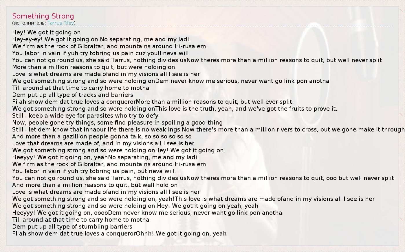 Hey! We got it going on Hey-ey-ey! We got it going on.No separating, me and my ladi. We firm as the rock of Gibraltar, and mountains around Hi-rusalem. You labor in vain if yuh try tobring us pain cuz youll neva will You can not go round us, she said Tarrus, nothing divides usNow theres more than a million reasons to quit, but well never split More than a million reasons to quit, but were holding on Love is what dreams are made ofand in my visions all I see is her We got something strong and so were holding onDem never know me serious, never want go link pon anotha Till around at that time to carry home to motha Dem put up all type of tracks and barriers Fi ah show dem dat true loves a conquerorMore than a million reasons to quit, but well ever split. We got something strong and so were holding onThis love is the truth, yeah, and we've got the fruits to prove it. Still I keep a wide eye for parasites who try to defy Now, people gone try things, some find pleasure in spoiling a good thing Still I let dem know that innaour life there is no weaklings.Now there's more than a million rivers to cross, but we gone make it through And more than a gazillion people gonna talk, so so so so so so Love that dreams are made of, and in my visions all I see is her We got something strong and so were holding onHey! We got it going on Heeyyy! We got it going on, yeahNo separating, me and my ladi. We firm as the rock of Gibraltar, and mountains around Hi-rusalem. You labor in vain if yuh try tobring us pain, but neva will You can not go round us, she said Tarrus, nothing divides usNow theres more than a million reasons to quit, ooo but well never split And more than a million reasons to quit, but well hold on Love is what dreams are made ofand in my visions all I see is her We got something strong and so were holding on, yeah!This love is what dreams are made ofand in my visions all I see is her We got something strong and so were holding on.Hey! We got it going on yeah, yeah Heeyyy! We got it going on, ooooDem never know me serious, never want go link pon anotha Till around at that time to carry home to motha Dem put up all type of stumbling barriers Fi ah show dem dat true loves a conquerorOhhh! We got it going on, yeah