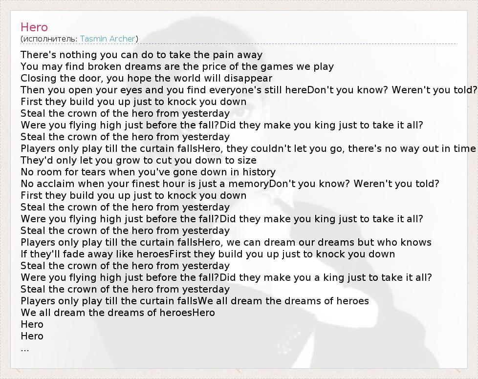 There's nothing you can do to take the pain away You may find broken dreams are the price of the games we play Closing the door, you hope the world will disappear Then you open your eyes and you find everyone's still hereDon't you know? Weren't you told? First they build you up just to knock you down Steal the crown of the hero from yesterday Were you flying high just before the fall?Did they make you king just to take it all? Steal the crown of the hero from yesterday Players only play till the curtain fallsHero, they couldn't let you go, there's no way out in time They'd only let you grow to cut you down to size No room for tears when you've gone down in history No acclaim when your finest hour is just a memoryDon't you know? Weren't you told? First they build you up just to knock you down Steal the crown of the hero from yesterday Were you flying high just before the fall?Did they make you king just to take it all? Steal the crown of the hero from yesterday Players only play till the curtain fallsHero, we can dream our dreams but who knows If they'll fade away like heroesFirst they build you up just to knock you down Steal the crown of the hero from yesterday Were you flying high just before the fall?Did they make you a king just to take it all? Steal the crown of the hero from yesterday Players only play till the curtain fallsWe all dream the dreams of heroes We all dream the dreams of heroesHero Hero Hero ...