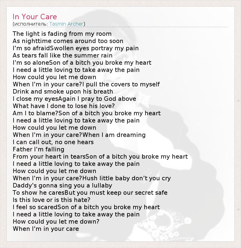 The light is fading from my room As nighttime comes around too soon I'm so afraidSwollen eyes portray my pain As tears fall like the summer rain I'm so aloneSon of a bitch you broke my heart I need a little loving to take away the pain How could you let me down When I'm in your care?I pull the covers to myself Drink and smoke upon his breath I close my eyesAgain I pray to God above What have I done to lose his love? Am I to blame?Son of a bitch you broke my heart I need a little loving to take away the pain How could you let me down When I'm in your care?When I am dreaming I can call out, no one hears Father I'm falling From your heart in tearsSon of a bitch you broke my heart I need a little loving to take away the pain How could you let me down When I'm in your care?Hush little baby don't you cry Daddy's gonna sing you a lullaby To show he caresBut you must keep our secret safe Is this love or is this hate? I feel so scaredSon of a bitch you broke my heart I need a little loving to take away the pain How could you let me down? When I'm in your care