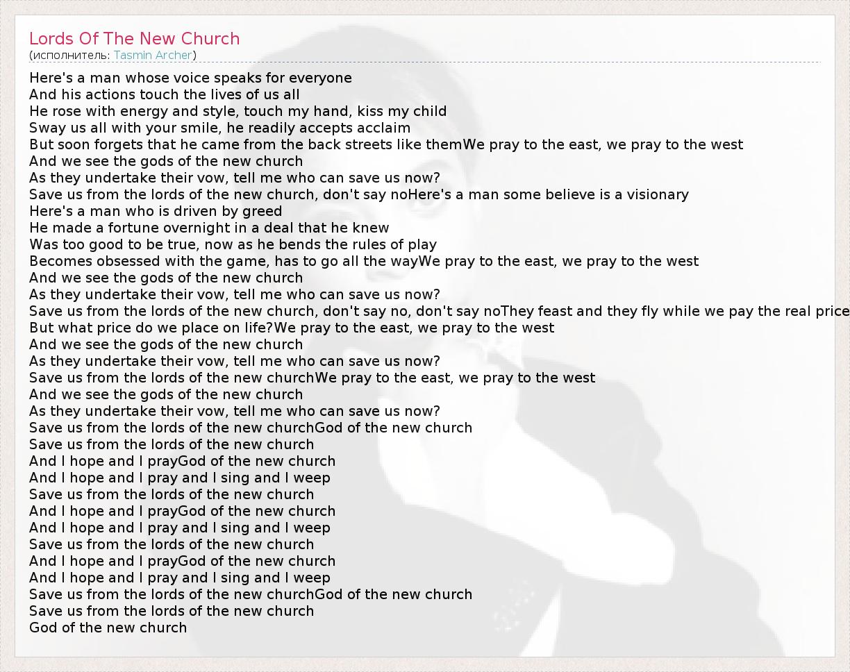 Here's a man whose voice speaks for everyone And his actions touch the lives of us all He rose with energy and style, touch my hand, kiss my child Sway us all with your smile, he readily accepts acclaim But soon forgets that he came from the back streets like themWe pray to the east, we pray to the west And we see the gods of the new church As they undertake their vow, tell me who can save us now? Save us from the lords of the new church, don't say noHere's a man some believe is a visionary Here's a man who is driven by greed He made a fortune overnight in a deal that he knew Was too good to be true, now as he bends the rules of play Becomes obsessed with the game, has to go all the wayWe pray to the east, we pray to the west And we see the gods of the new church As they undertake their vow, tell me who can save us now? Save us from the lords of the new church, don't say no, don't say noThey feast and they fly while we pay the real price But what price do we place on life?We pray to the east, we pray to the west And we see the gods of the new church As they undertake their vow, tell me who can save us now? Save us from the lords of the new churchWe pray to the east, we pray to the west And we see the gods of the new church As they undertake their vow, tell me who can save us now? Save us from the lords of the new churchGod of the new church Save us from the lords of the new church And I hope and I prayGod of the new church And I hope and I pray and I sing and I weep Save us from the lords of the new church And I hope and I prayGod of the new church And I hope and I pray and I sing and I weep Save us from the lords of the new church And I hope and I prayGod of the new church And I hope and I pray and I sing and I weep Save us from the lords of the new churchGod of the new church Save us from the lords of the new church God of the new church