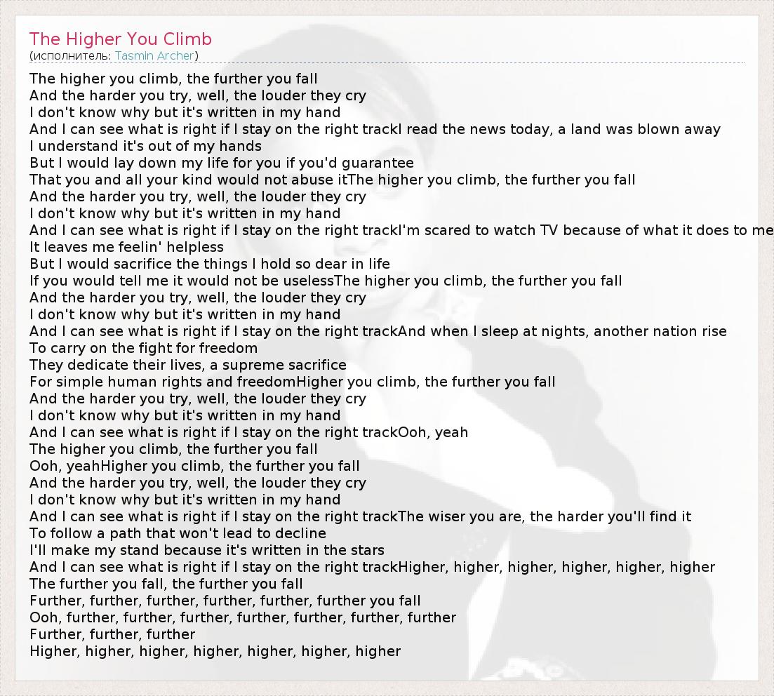 The higher you climb, the further you fall And the harder you try, well, the louder they cry I don't know why but it's written in my hand And I can see what is right if I stay on the right trackI read the news today, a land was blown away I understand it's out of my hands But I would lay down my life for you if you'd guarantee That you and all your kind would not abuse itThe higher you climb, the further you fall And the harder you try, well, the louder they cry I don't know why but it's written in my hand And I can see what is right if I stay on the right trackI'm scared to watch TV because of what it does to me It leaves me feelin' helpless But I would sacrifice the things I hold so dear in life If you would tell me it would not be uselessThe higher you climb, the further you fall And the harder you try, well, the louder they cry I don't know why but it's written in my hand And I can see what is right if I stay on the right trackAnd when I sleep at nights, another nation rise To carry on the fight for freedom They dedicate their lives, a supreme sacrifice For simple human rights and freedomHigher you climb, the further you fall And the harder you try, well, the louder they cry I don't know why but it's written in my hand And I can see what is right if I stay on the right trackOoh, yeah The higher you climb, the further you fall Ooh, yeahHigher you climb, the further you fall And the harder you try, well, the louder they cry I don't know why but it's written in my hand And I can see what is right if I stay on the right trackThe wiser you are, the harder you'll find it To follow a path that won't lead to decline I'll make my stand because it's written in the stars And I can see what is right if I stay on the right trackHigher, higher, higher, higher, higher, higher The further you fall, the further you fall Further, further, further, further, further, further you fall Ooh, further, further, further, further, further, further, further Further, further, further Higher, higher, higher, higher, higher, higher, higher