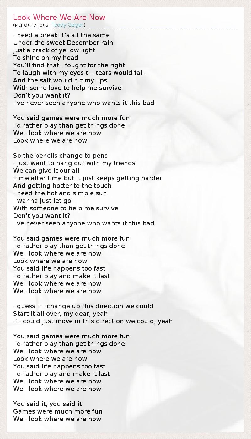 А как ты думаешь, о чем песня "Look Where We Are Now" ?