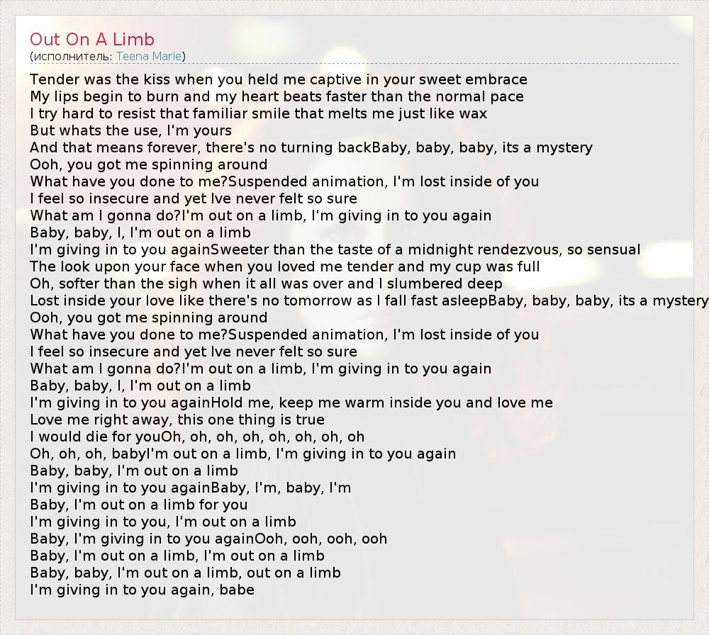 Tender was the kiss when you held me captive in your sweet embrace My lips begin to burn and my heart beats faster than the normal pace I try hard to resist that familiar smile that melts me just like wax But whats the use, I'm yours And that means forever, there's no turning backBaby, baby, baby, its a mystery Ooh, you got me spinning around What have you done to me?Suspended animation, I'm lost inside of you I feel so insecure and yet Ive never felt so sure What am I gonna do?I'm out on a limb, I'm giving in to you again Baby, baby, I, I'm out on a limb I'm giving in to you againSweeter than the taste of a midnight rendezvous, so sensual The look upon your face when you loved me tender and my cup was full Oh, softer than the sigh when it all was over and I slumbered deep Lost inside your love like there's no tomorrow as I fall fast asleepBaby, baby, baby, its a mystery Ooh, you got me spinning around What have you done to me?Suspended animation, I'm lost inside of you I feel so insecure and yet Ive never felt so sure What am I gonna do?I'm out on a limb, I'm giving in to you again Baby, baby, I, I'm out on a limb I'm giving in to you againHold me, keep me warm inside you and love me Love me right away, this one thing is true I would die for youOh, oh, oh, oh, oh, oh, oh, oh Oh, oh, oh, babyI'm out on a limb, I'm giving in to you again Baby, baby, I'm out on a limb I'm giving in to you againBaby, I'm, baby, I'm Baby, I'm out on a limb for you I'm giving in to you, I'm out on a limb Baby, I'm giving in to you againOoh, ooh, ooh, ooh Baby, I'm out on a limb, I'm out on a limb Baby, baby, I'm out on a limb, out on a limb I'm giving in to you again, babe