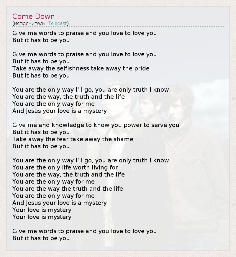 Give me words to praise and you love to love you But it has to be you Give me words to praise and you love to love you But it has to be you Take away the selfishness take away the pride But it has to be you You are the only way I'll go, you are only truth I know You are the way, the truth and the life You are the only way for me And Jesus your love is a mystery Give me and knowledge to know you power to serve you But it has to be you Take away the fear take away the shame But it has to be you You are the only way I'll go, you are only truth I know You are the only life worth living for You are the way, the truth and the life You are the only way for me You are the way the truth and the life You are the only way for me And Jesus your love is a mystery Your love is mystery Your love is mystery Give me words to praise and you love to love you But it has to be you
