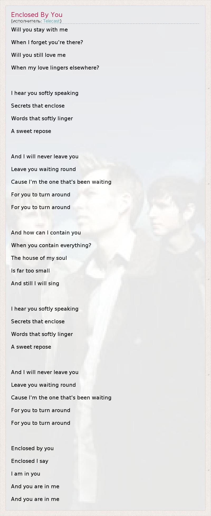 Will you stay with me When I forget you're there? Will you still love me When my love lingers elsewhere? I hear you softly speaking Secrets that enclose Words that softly linger A sweet repose And I will never leave you Leave you waiting round Cause I'm the one that's been waiting For you to turn around For you to turn around And how can I contain you When you contain everything? The house of my soul Is far too small And still I will sing I hear you softly speaking Secrets that enclose Words that softly linger A sweet repose And I will never leave you Leave you waiting round Cause I'm the one that's been waiting For you to turn around For you to turn around Enclosed by you Enclosed I say I am in you And you are in me And you are in me